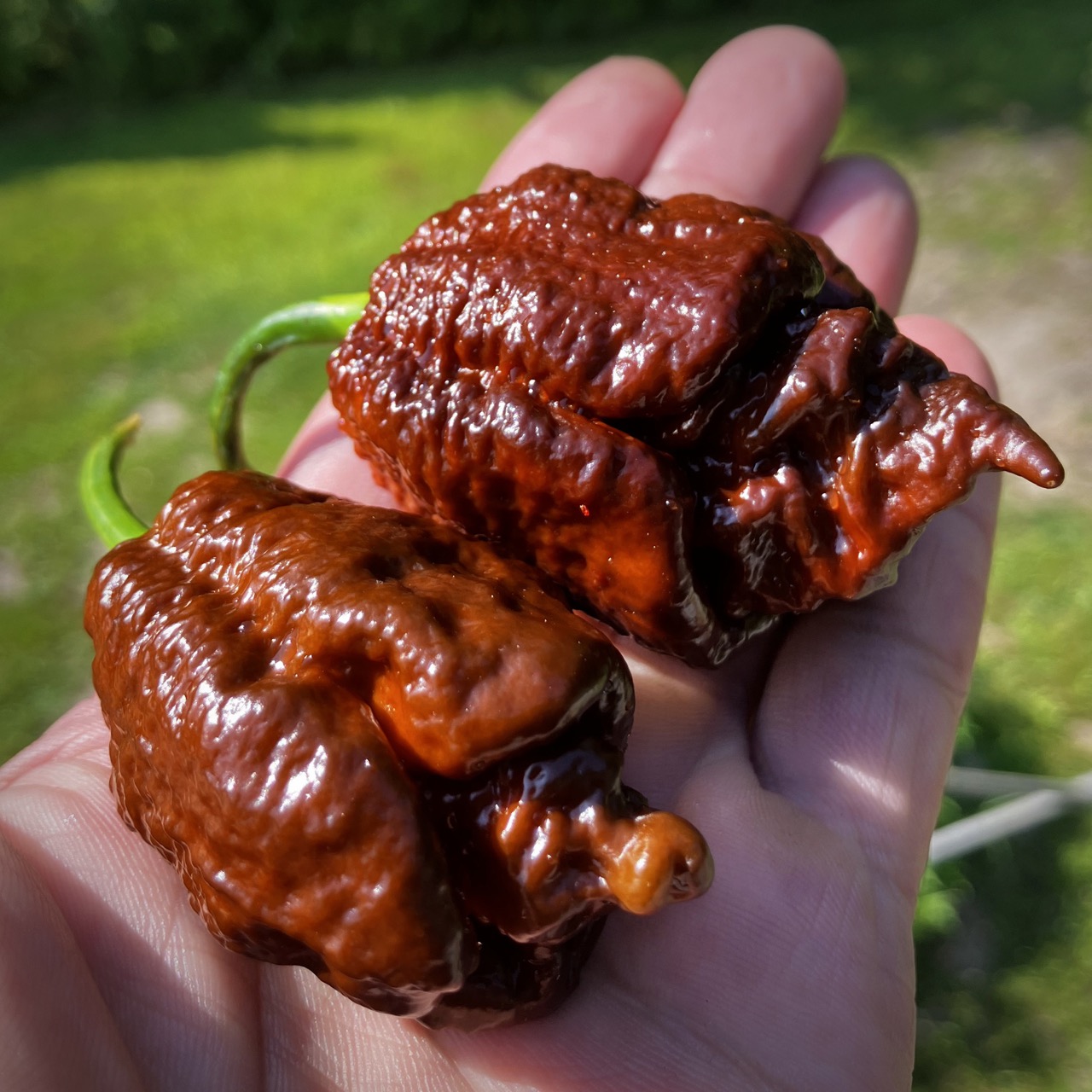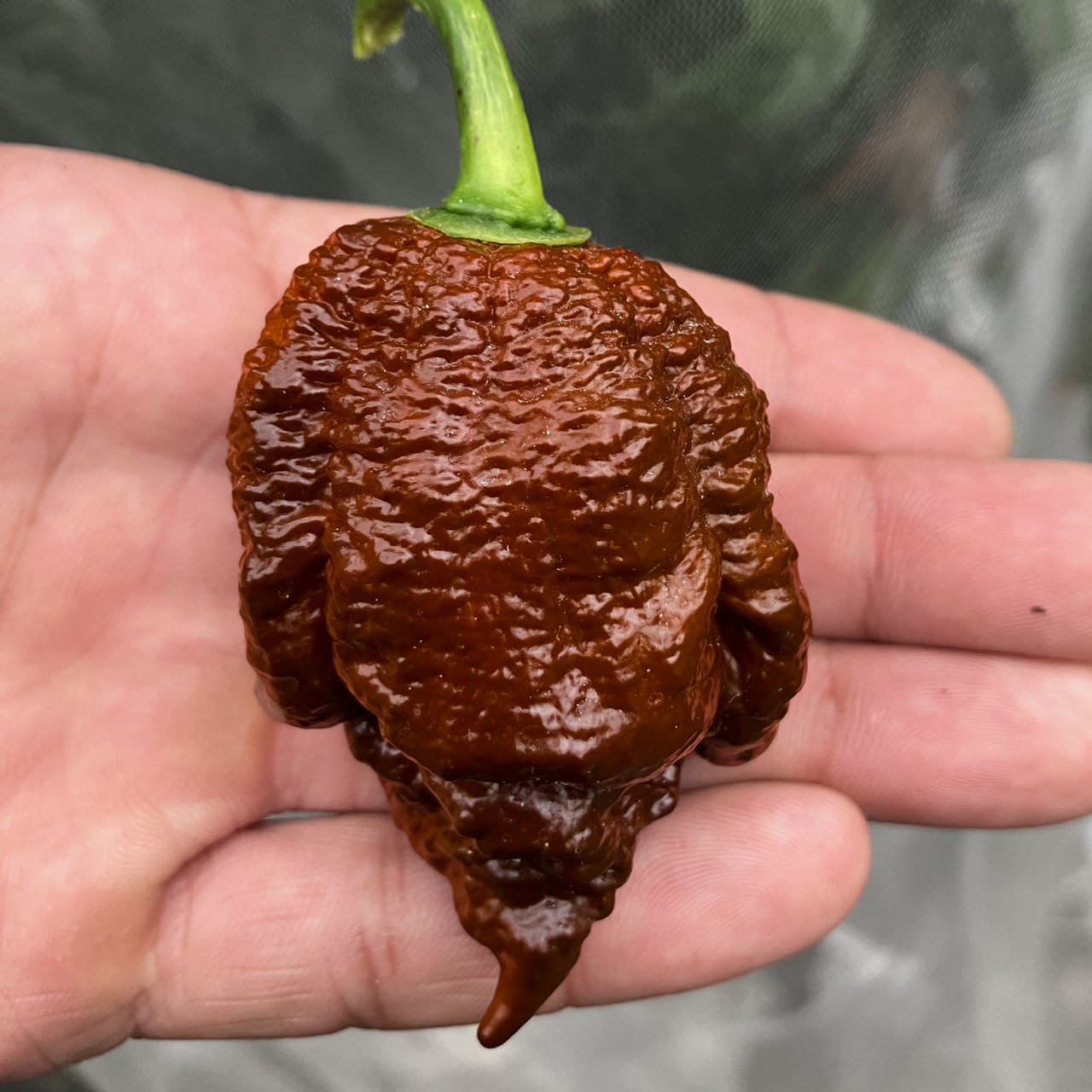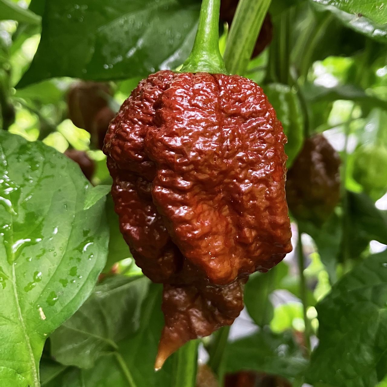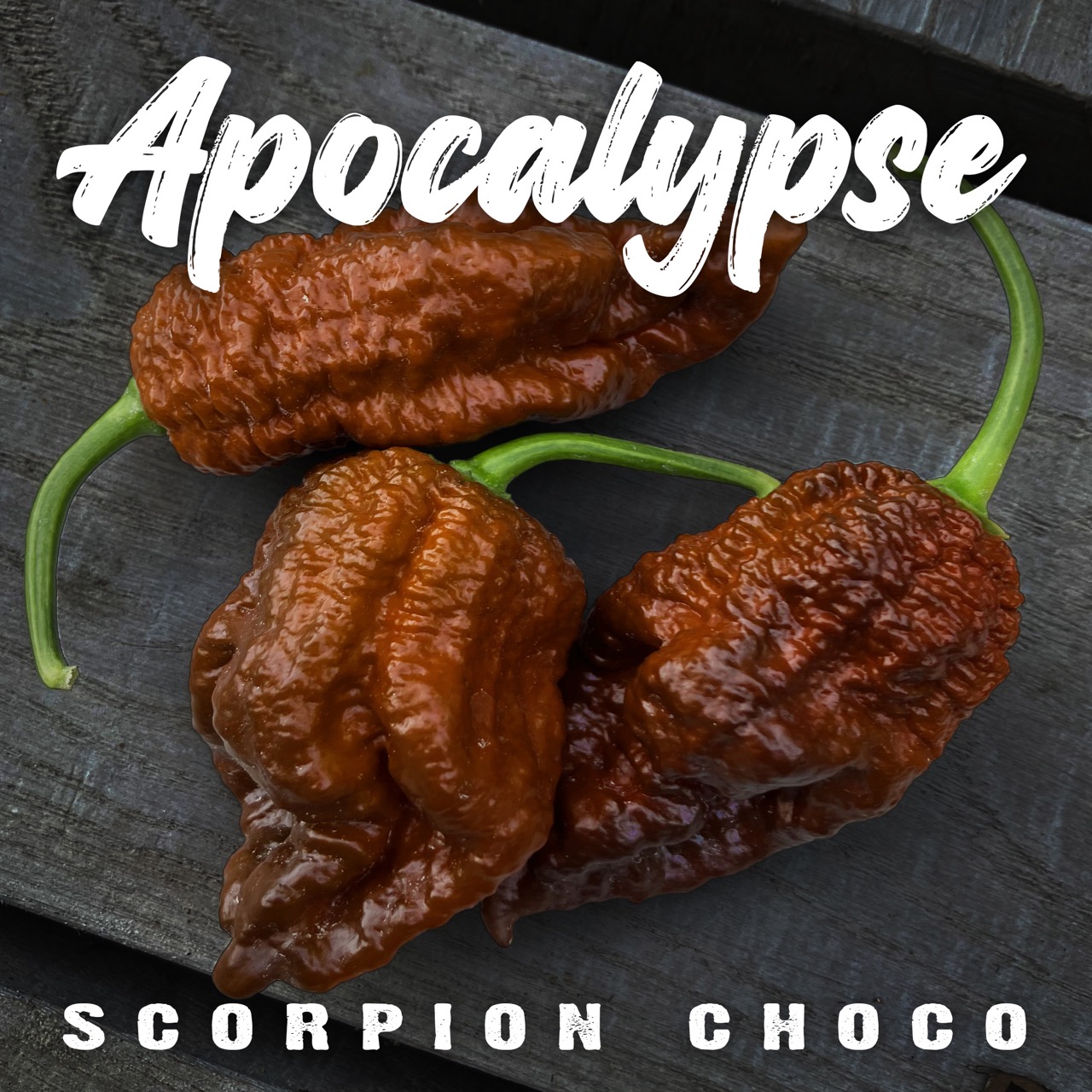 The Apocalypse Scorpion Choco is a variant of the formidable Apocalypse Scorpion, developed in Italy, and known for its extreme heat and rich, complex flavor profile. Its chocolate brown hue gives it an appearance as intense as its heat. The fruits are bumpy and elongated, with a stinger-like tip, typical of “Scorpion” varieties. They ripen from dark green to deep chocolate brown. Their thick, oily flesh releases an earthy, slightly smoky, and fruity flavor, accompanied by a persistent burn that intensifies slowly. The Apocalypse Scorpion Choco combines the explosive power of the strongest chinense varieties with a rich and aromatic flavor, sought after by superhot connoisseurs. The plant is vigorous and very productive, offering abundant harvests.