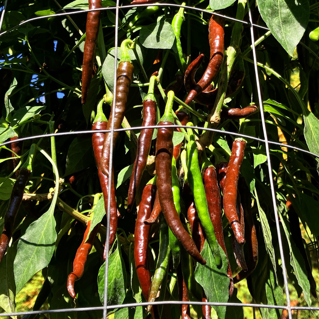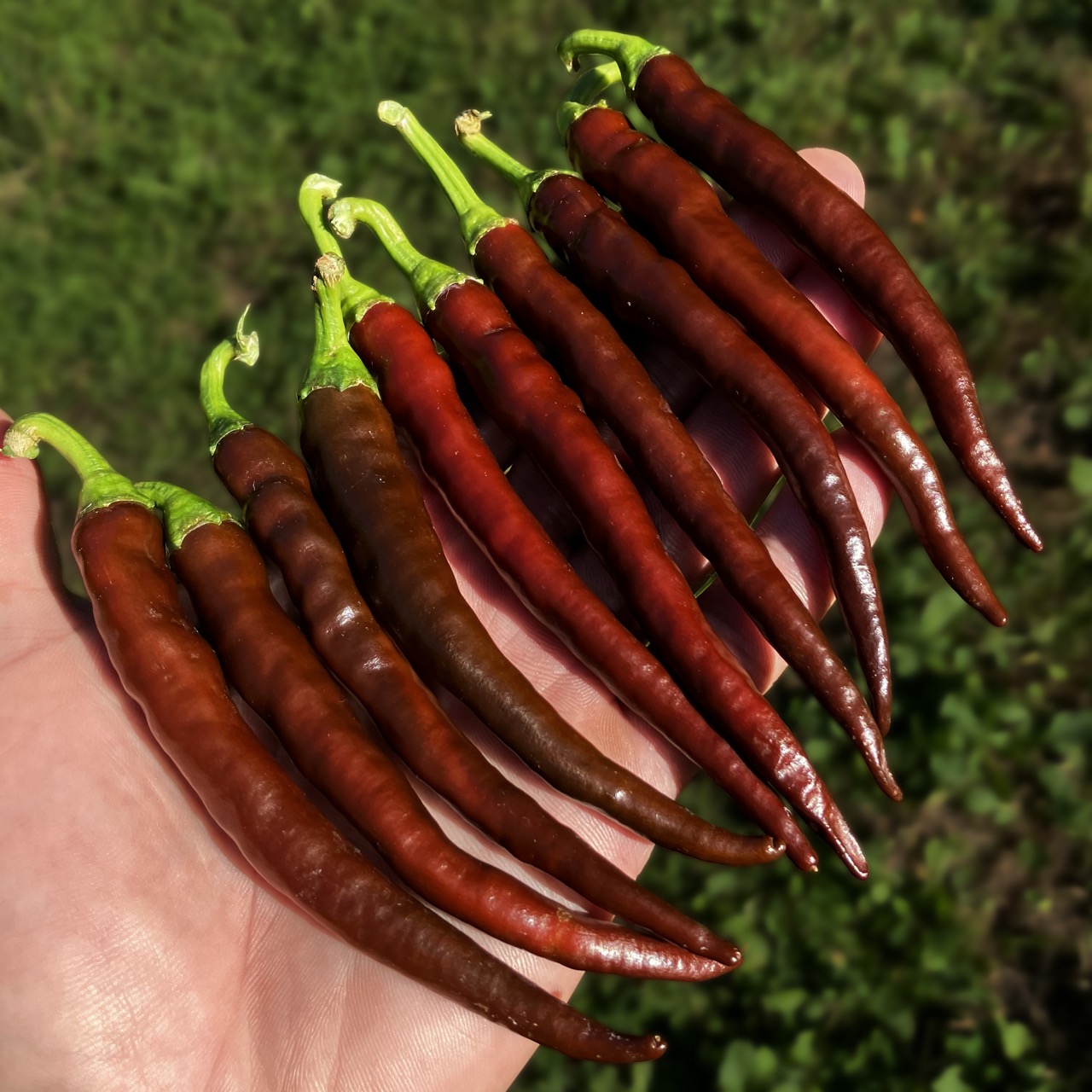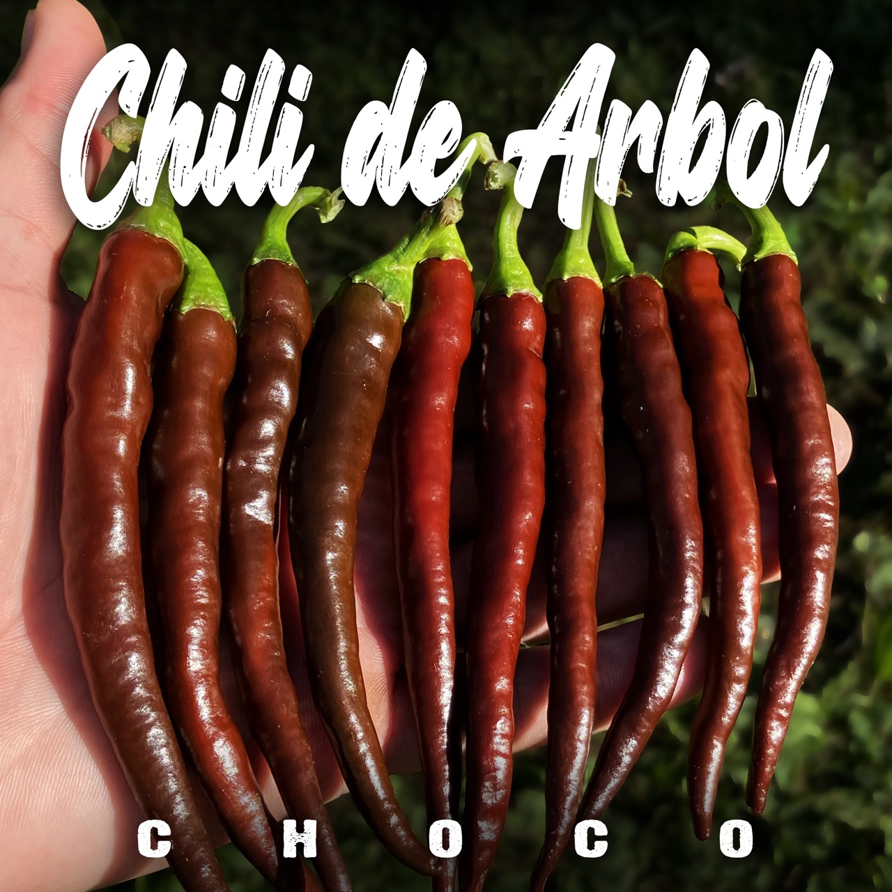 The Chocolate Chili de Arbol originated from a natural variation recently discovered in 2024 by Gerald Lunz of FuegoFruitCo in Texas within his Chili de Arbol Oaxaca crop. He shared seeds from this discovery with us, and all plants grown from this generation produced chocolate brown fruits. While the lineage is isolated, the recessive red gene may occasionally reappear, which is why the color cannot be 100% guaranteed. The long, thin, and glossy fruits ripen from green to chocolate brown. Their moderate heat is accompanied by a slightly smoky flavor, offering an even more complex and refined taste profile than the red type.