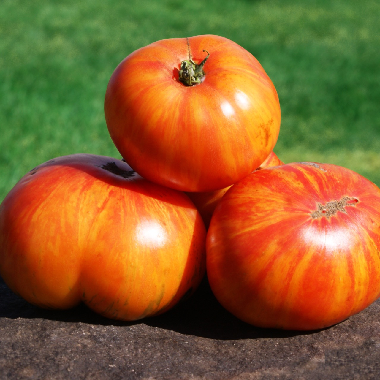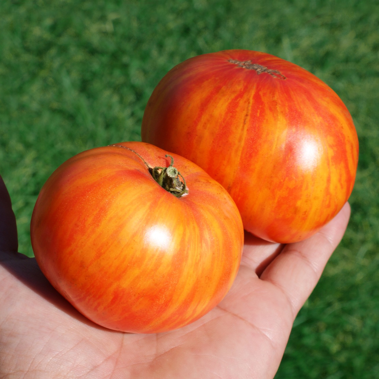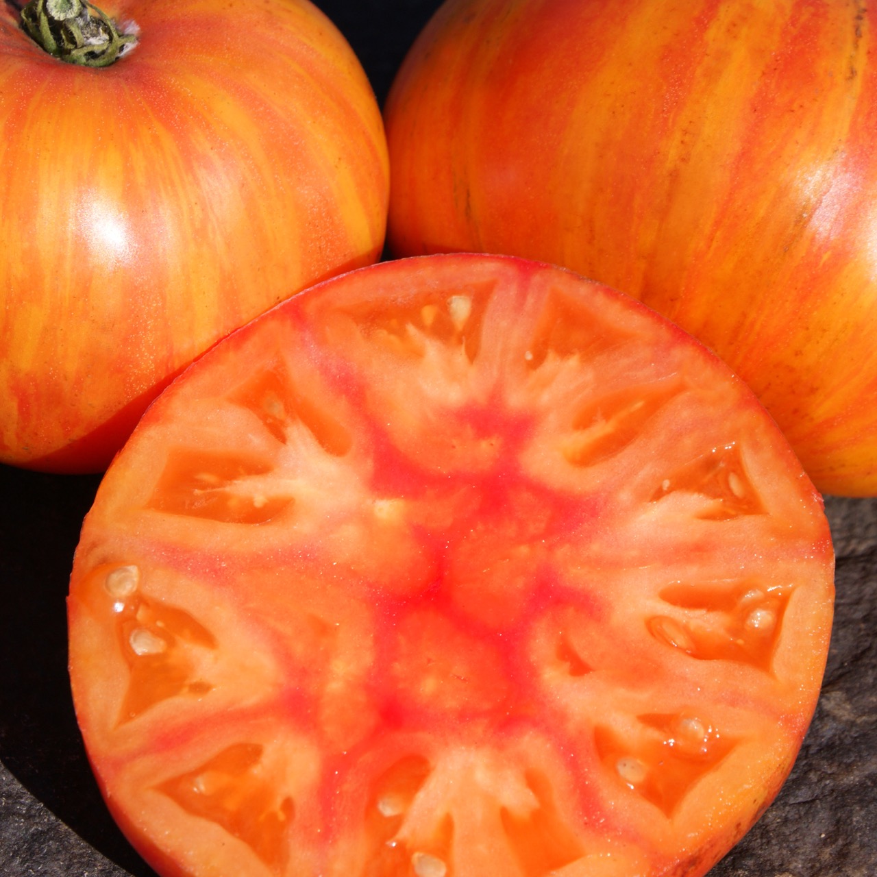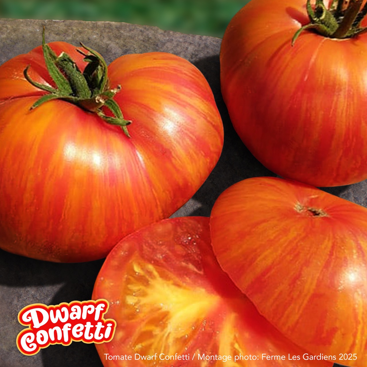 Dwarf Confetti is a dwarf variety from the Dwarf Tomato Project, renowned for its compact, productive, and exceptionally decorative tomatoes. It yields medium-sized, marbled/pineapple-type fruits, beautifully striped with yellow, orange, and red, creating a ‘confetti’ effect that gives it its name. The flesh is dense, juicy, and highly aromatic, offering a pleasant sweetness and a subtle balance of sugar and acidity. Thanks to its determinate dwarf habit, the plant remains compact while providing excellent productivity, making it perfect for pots, containers, and small gardens. Dwarf Confetti is distinguished by its spectacular appearance, ease of cultivation, and fruity flavor, making it a prized variety for both its beauty and taste.