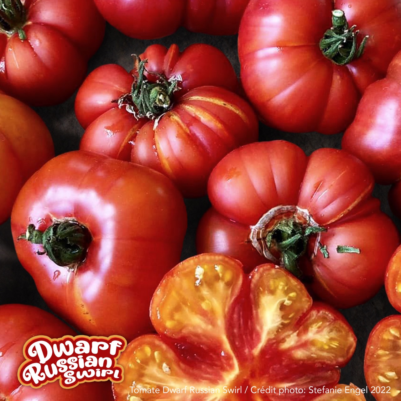 Dwarf Russian Swirl is a compact variety from the Dwarf Tomato Project, created to offer a dwarf plant rich in colors and flavors. It produces fruits with bicolored red and yellow skin, usually without stripes, but featuring a very aesthetic marbled flesh when sliced. The flavor is sweet, juicy, fruity, and well-balanced, true to classic marbled varieties. Its determinate dwarf habit makes it ideal for growing in pots, containers, and small gardens, while maintaining good and consistent productivity. Dwarf Russian Swirl stands out with its magnificent flesh, vibrant color, and excellent flavor, perfect for marbled tomato lovers in a compact format.