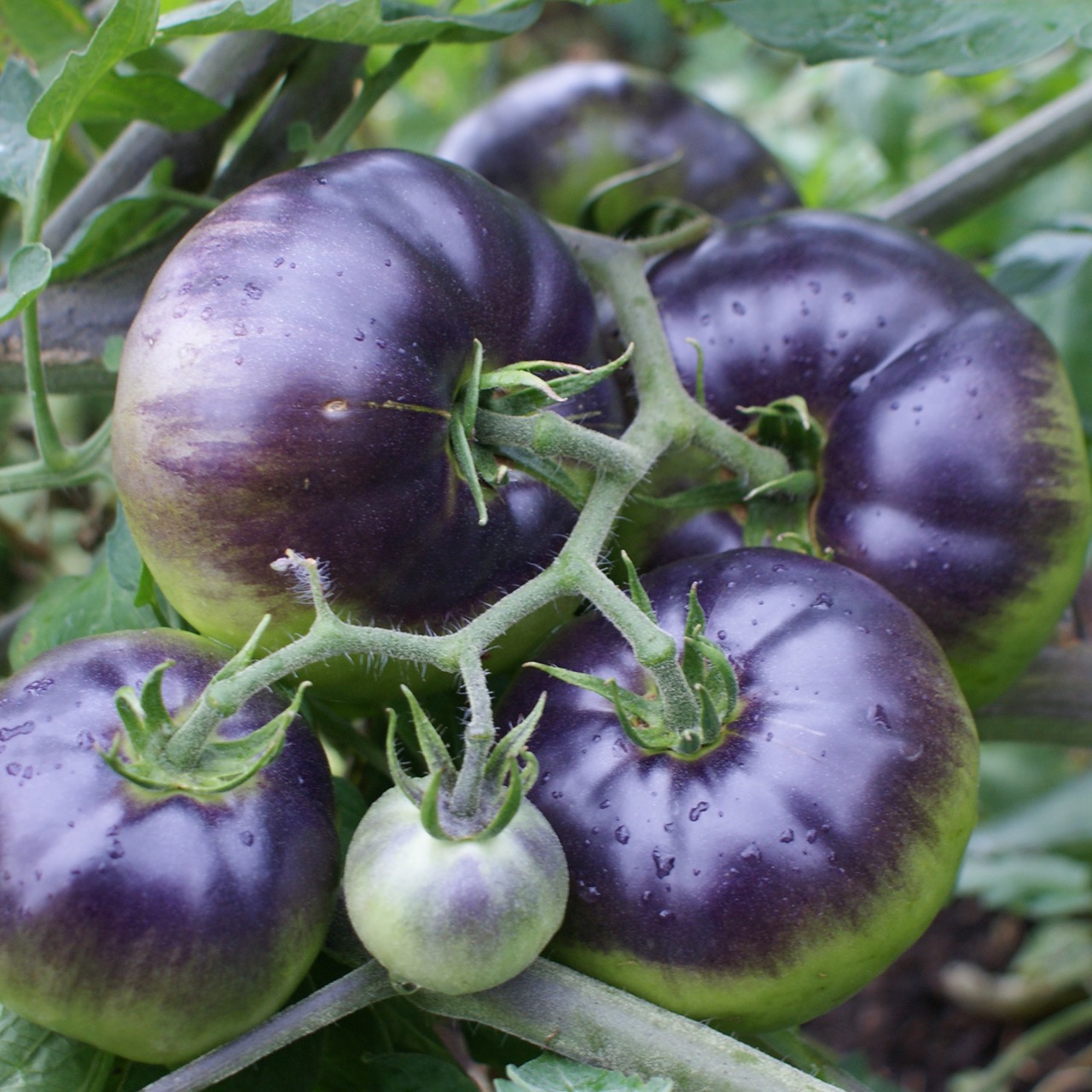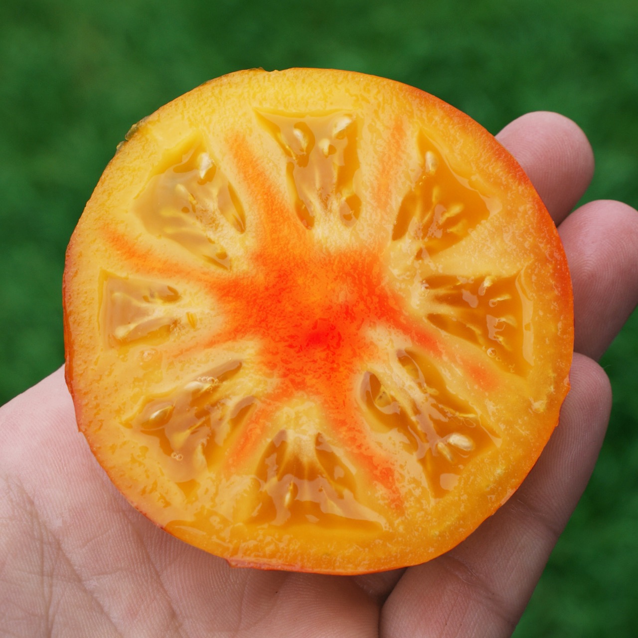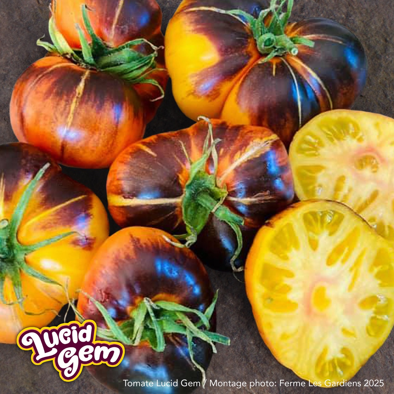 Lucid Gem is one of the most iconic varieties created in 2016 by Brad Gates of Wild Boar Farms. While there is no information on the cross used, it is nevertheless appreciated for its spectacular beauty and exceptional flavor. The tomatoes display a yellow-orange skin marbled with red, often accompanied by a slight anthocyanin blush on the shoulders depending on sun exposure. This color combination creates a “gem” effect that inspired its name. Inside, the flesh is orange and red, melting, juicy, and particularly aromatic. The flavor is sweet, fruity, rich, with a superb balance between sugar and acidity. The plant is vigorous and productive, offering a regular harvest of fruits from mid-season until autumn.