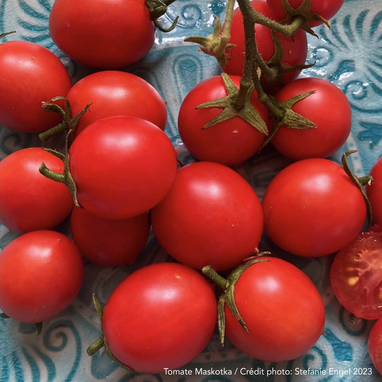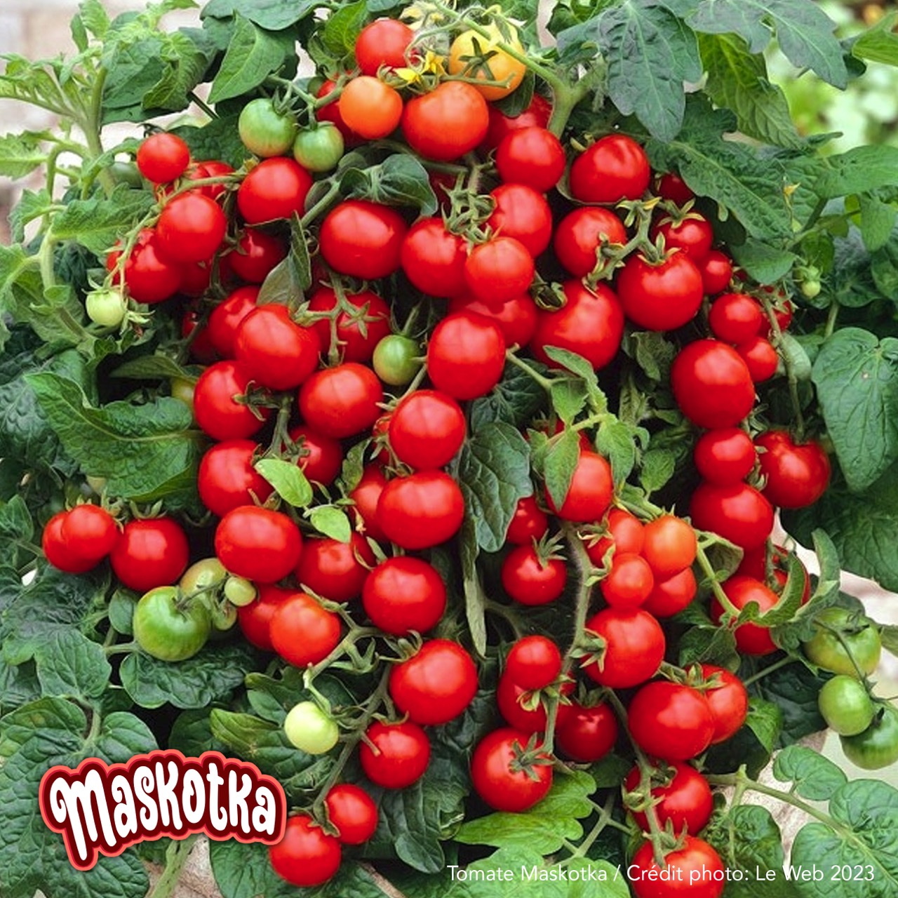 Maskotka is a Polish variety specially developed for cultivation in pots, balcony planters, and small spaces. The plant is determinate, very compact, and slightly trailing, forming a dense and decorative bush that requires neither pruning nor staking. It is renowned for its ease of cultivation and its ability to produce quickly. It offers an abundant and early production of small, red, round, and smooth cherry tomatoes with a sweet, mild, and very aromatic taste. The fruits continuously ripen over a long period, even in cooler conditions or on a less exposed balcony. Its hardiness, productivity, and compact size make Maskotka one of the best varieties for urban gardeners, container gardens, or those who desire a quick and generous harvest without complex maintenance.