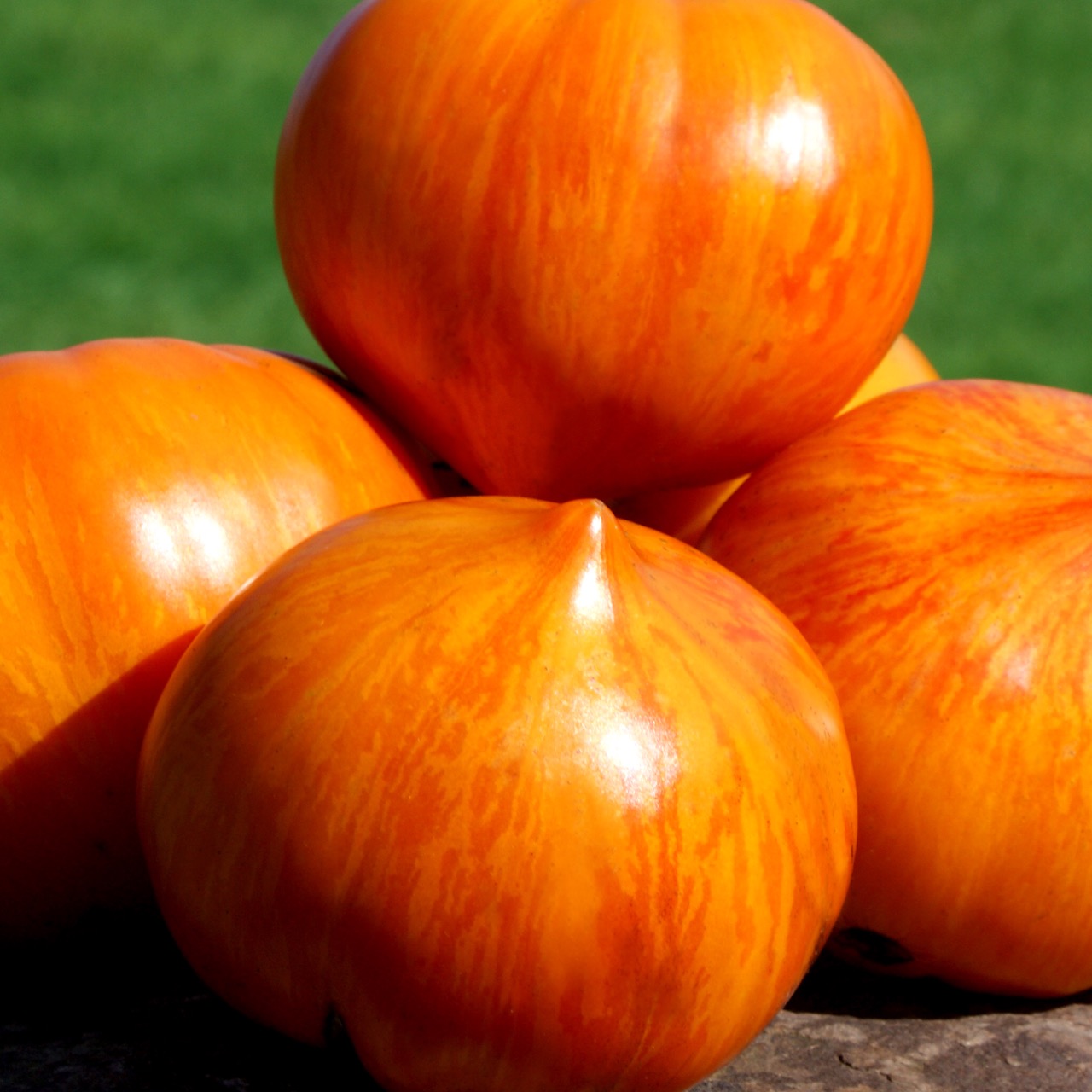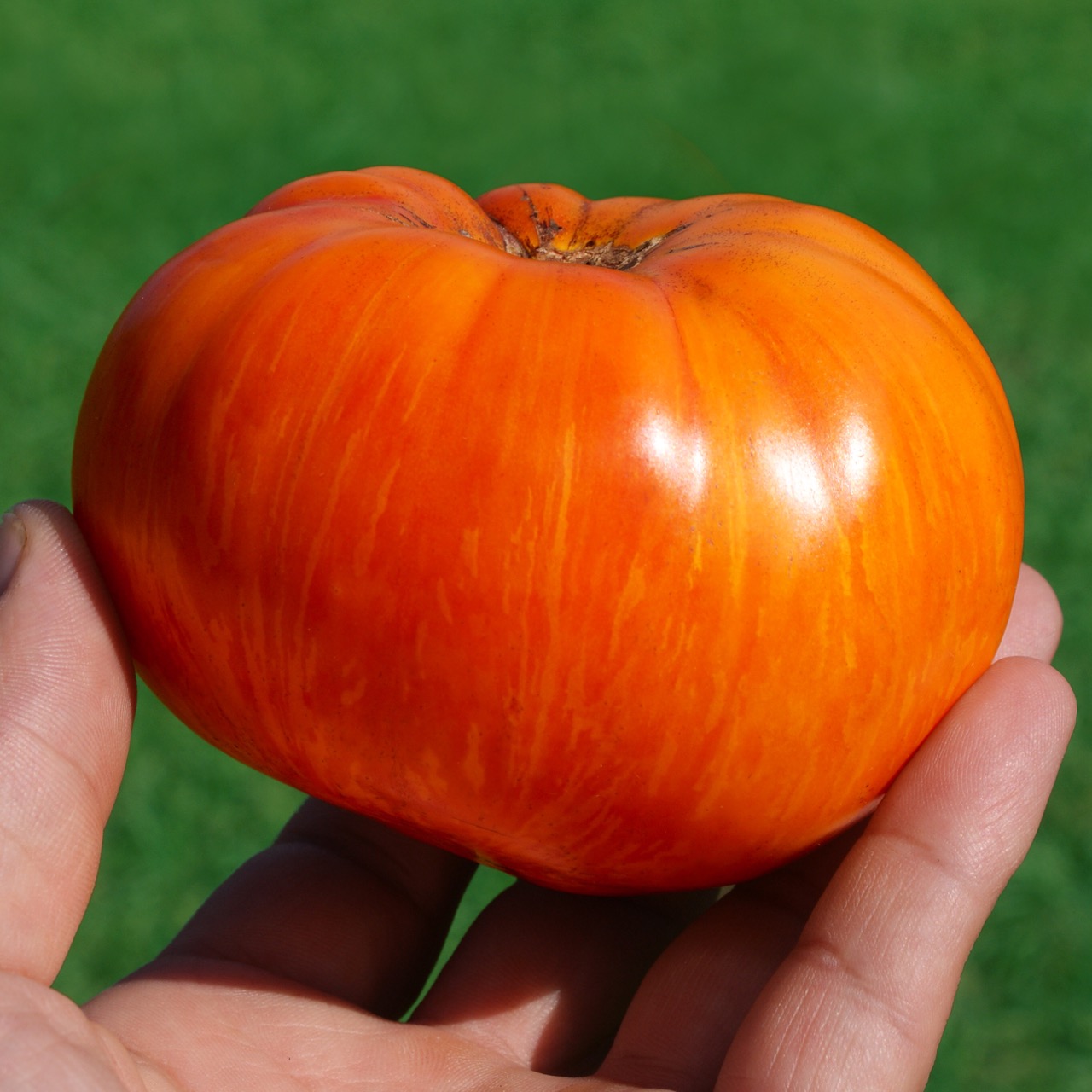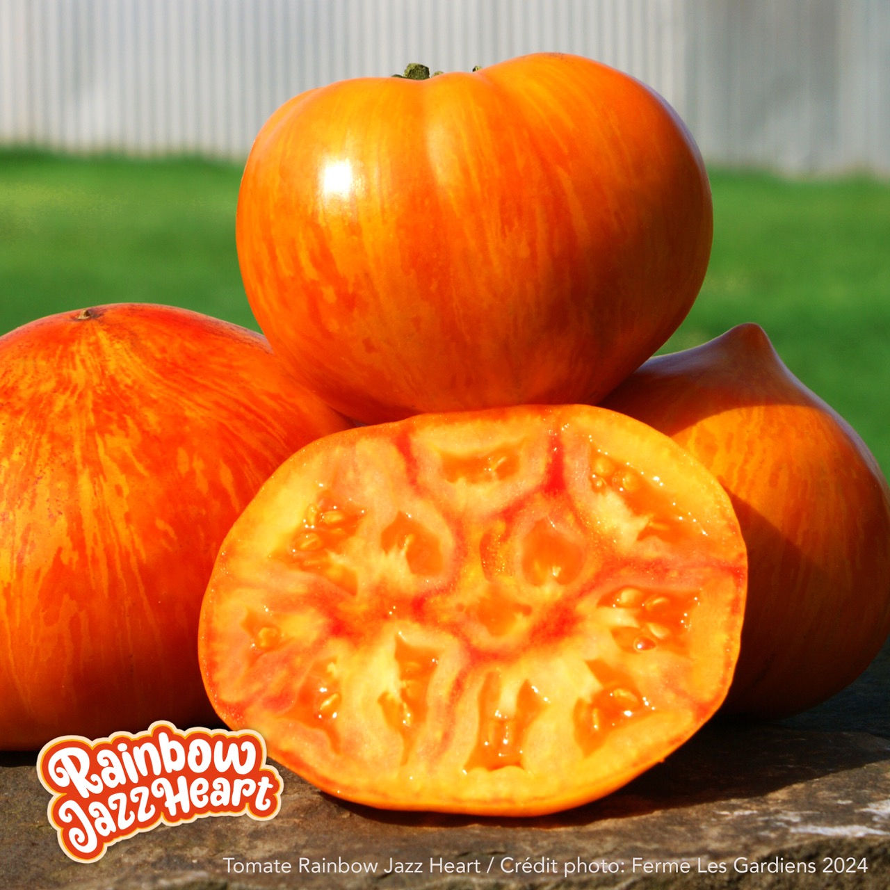Rainbow Jazz Heart is a modern variety created by American breeder Fred Hempel, founder of Artisan Seeds in California. It is renowned for its spectacular colors, generous size, and superior taste quality. The plant, with indeterminate growth, is vigorous and offers a regular production of large beefsteak-shaped fruits. The fruits display a superb orange-yellow skin marbled with pink and red, with dense, juicy, and melting flesh, containing very few seeds. They can also be eaten when they are yellow with green stripes: at this early stage, their flavor is tangy and lemony, offering a completely different and very refreshing taste. At full maturity, the flavor becomes sweet, fruity, complex, with remarkable aromatic depth. Versatile and always impressive when sliced, Rainbow Jazz Heart is ideal for thick slices, salads, or to highlight its unique aesthetic.