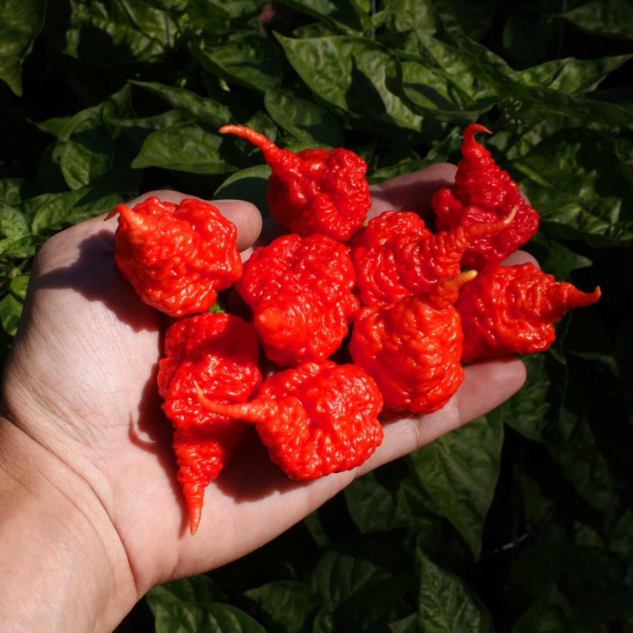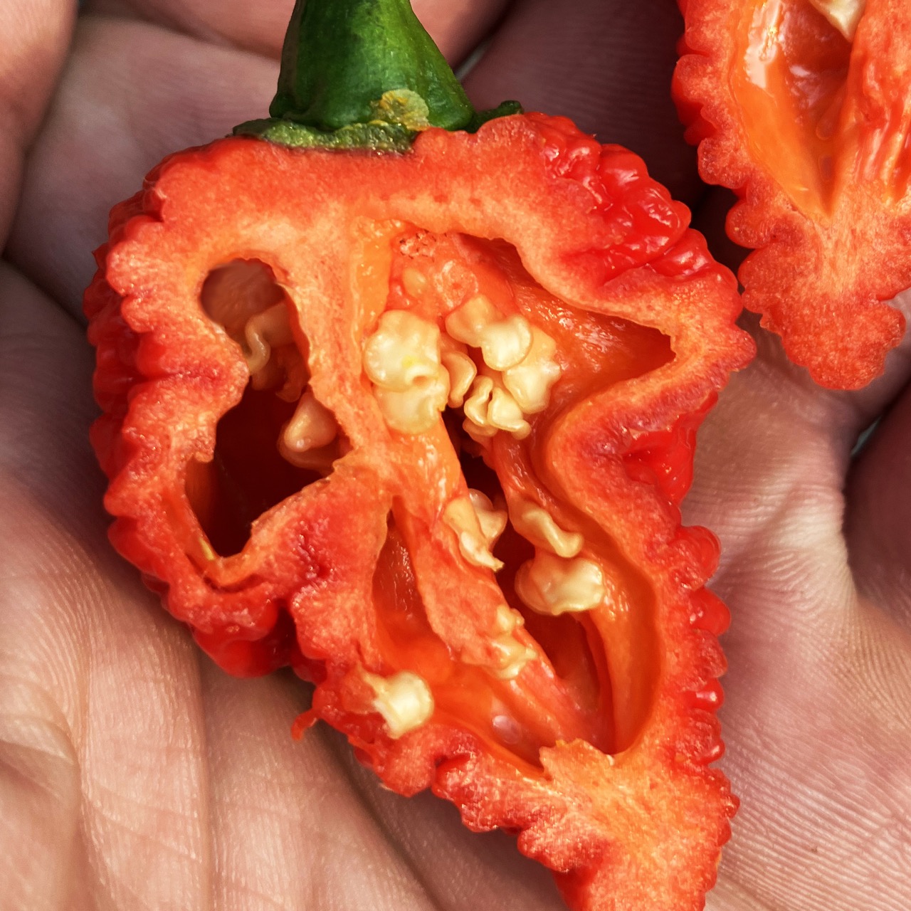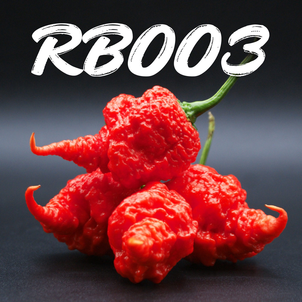The RB003 is a spectacular superhot hybrid resulting from a cross between a yellow Carolina Reaper and a 7 Pot Brainstrain. The acronym “RB” refers both to this genetic combination (Reaper × Brainstrain) and to its creator, Australian grower Ross Barber. The fruits have a formidable appearance, resembling large Scorpions, with very bumpy and prickly skin reminiscent of the Reaper, often extended by a slender tail. They ripen from lime green to an intense dark red, offering a striking appearance. Their extreme heat rivals the world’s most potent peppers, while, for the bravest, revealing fruity and slightly sweet notes in the aftertaste.