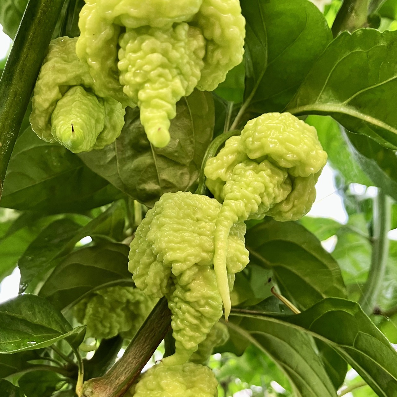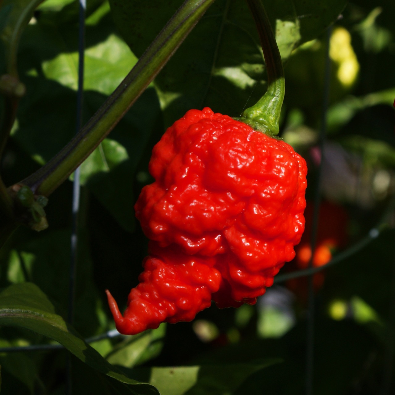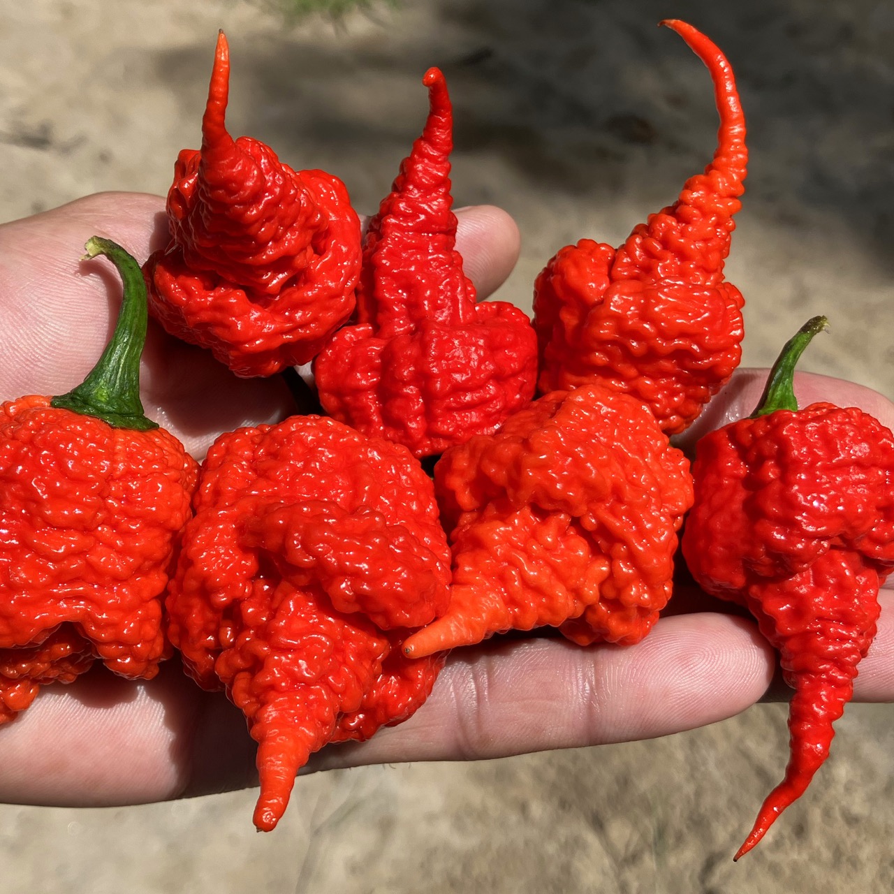 The RB003 is a spectacular superhot hybrid resulting from a cross between a yellow Carolina Reaper and a 7 Pot Brainstrain. The acronym “RB” refers both to this genetic combination (Reaper × Brainstrain) and to its creator, Australian grower Ross Barber. The fruits have a formidable appearance, resembling large Scorpions, with very bumpy and prickly skin reminiscent of the Reaper, often extended by a slender tail. They ripen from lime green to an intense dark red, offering a striking appearance. Their extreme heat rivals the world’s most potent peppers, while, for the bravest, revealing fruity and slightly sweet notes in the aftertaste.