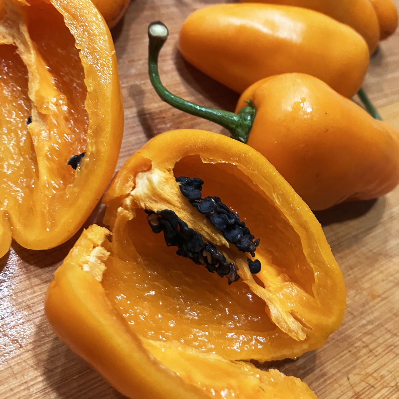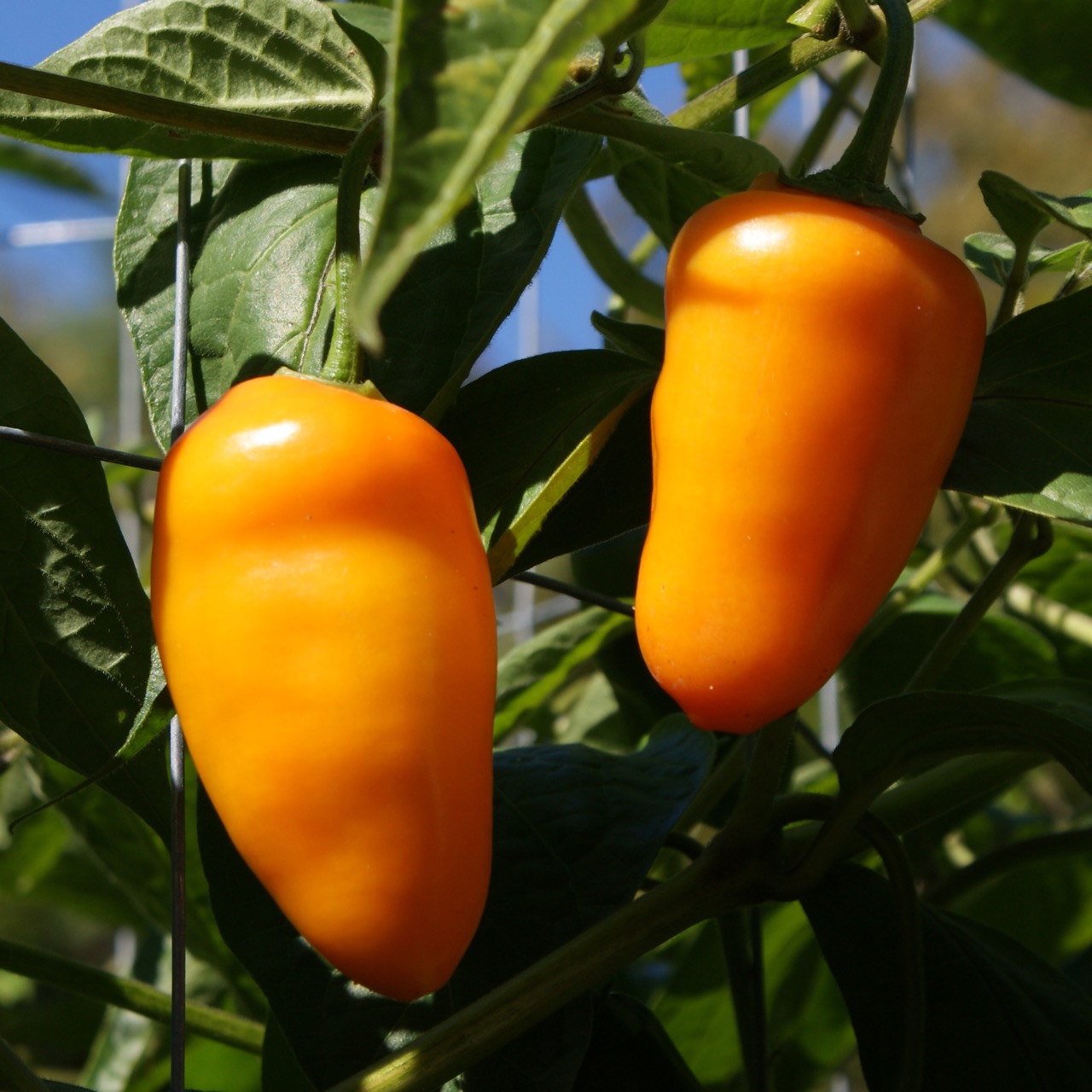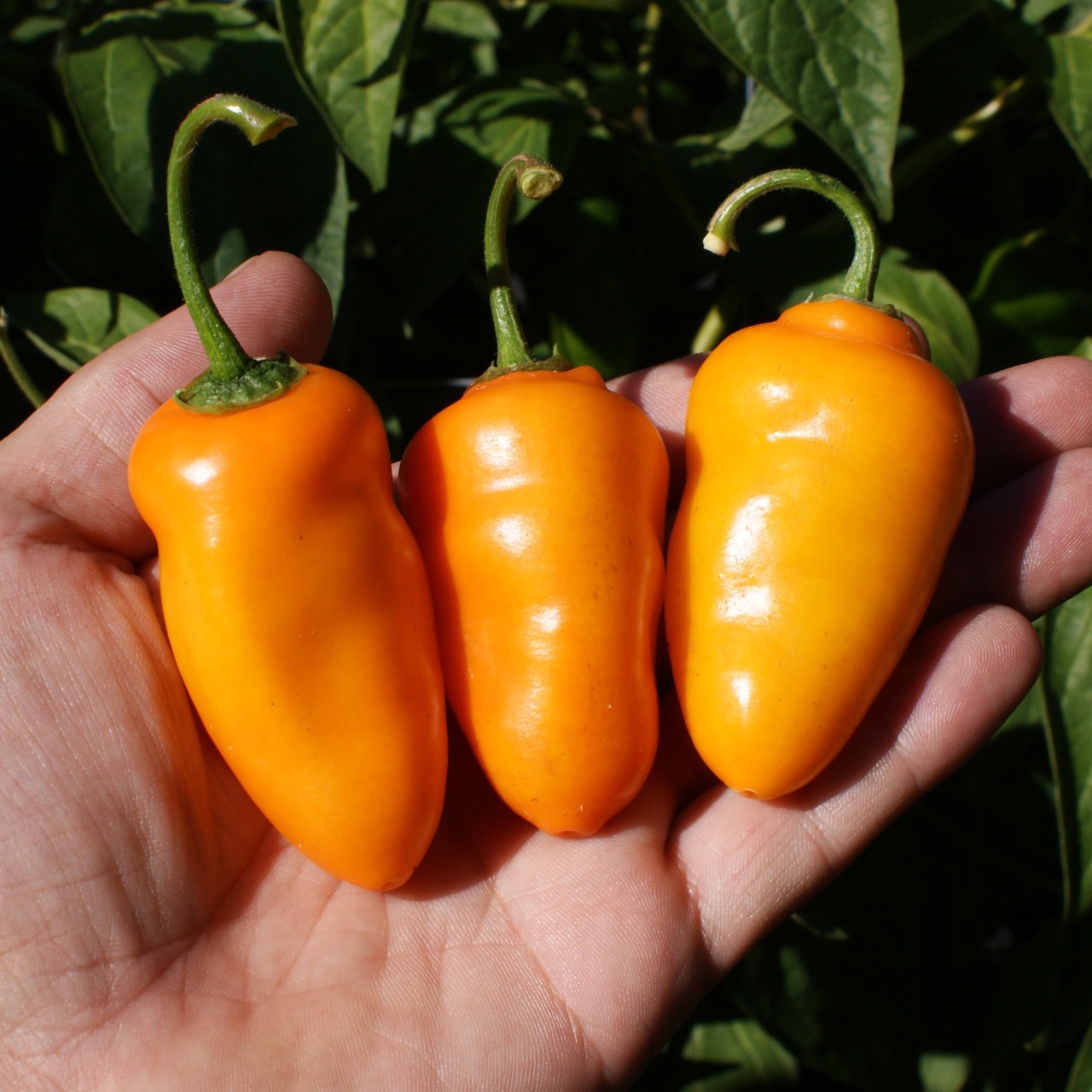 The Rocoto Turbo Pube is a classic Capsicum pubescens variety originating from the Bolivian Andes, recognized for its exceptional vigor and abundant production of meaty fruits, making it by far the most productive among our rocoto varieties. The peppers, rounded to slightly elongated in shape, ripen from green to orange-yellow at maturity. Their thick, juicy flesh offers a fruity and slightly sweet flavor, accompanied by a sustained yet pleasant heat. The plant, robust and highly branched, features the velvety foliage and black seeds characteristic of the species. Adapted to temperate climates, it tolerates cold better than most other chili pepper species. According to many, rocotos are among the most flavorful peppers in the world! They possess exceptional culinary potential thanks to their thick, juicy, and fragrant flesh, which holds up perfectly to cooking. Their moderate and fruity heat pairs wonderfully with almost all types of dishes.