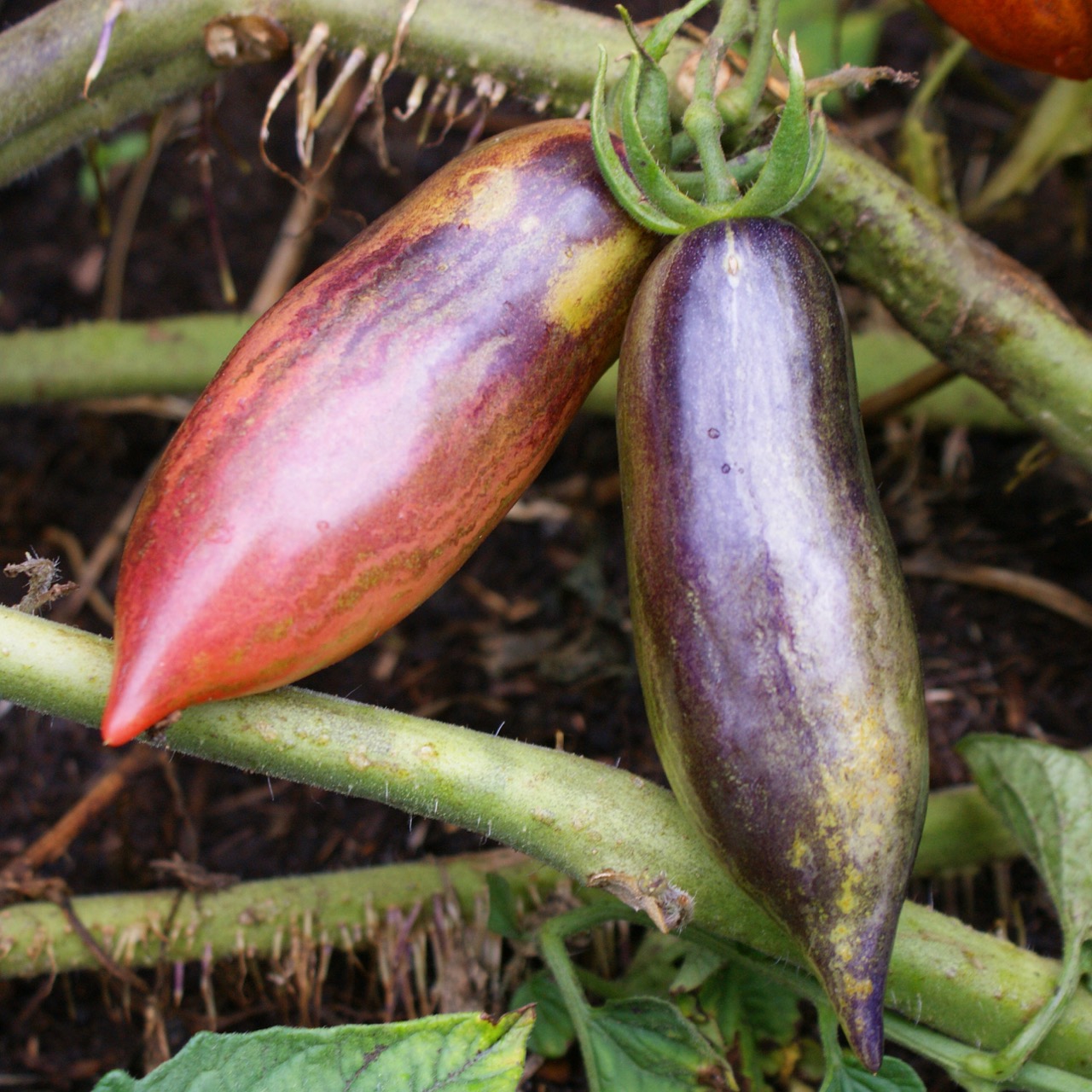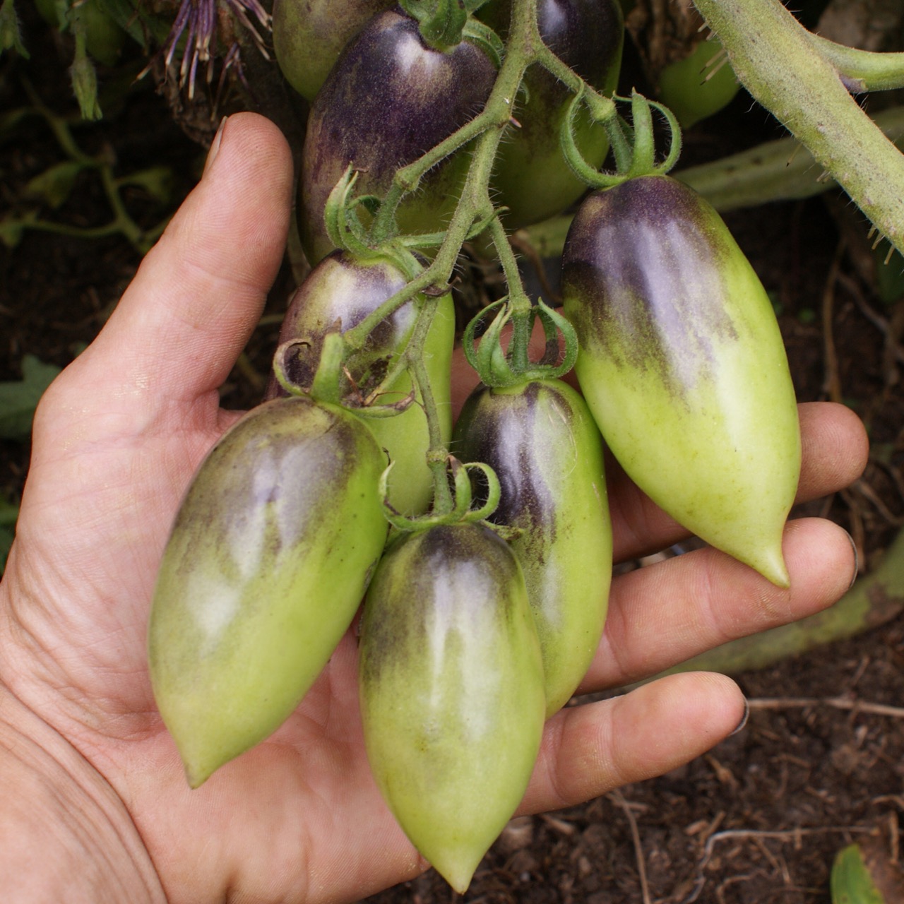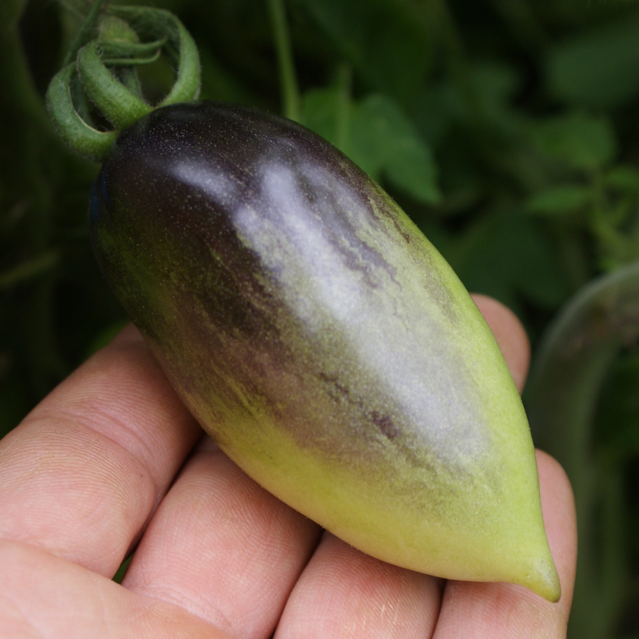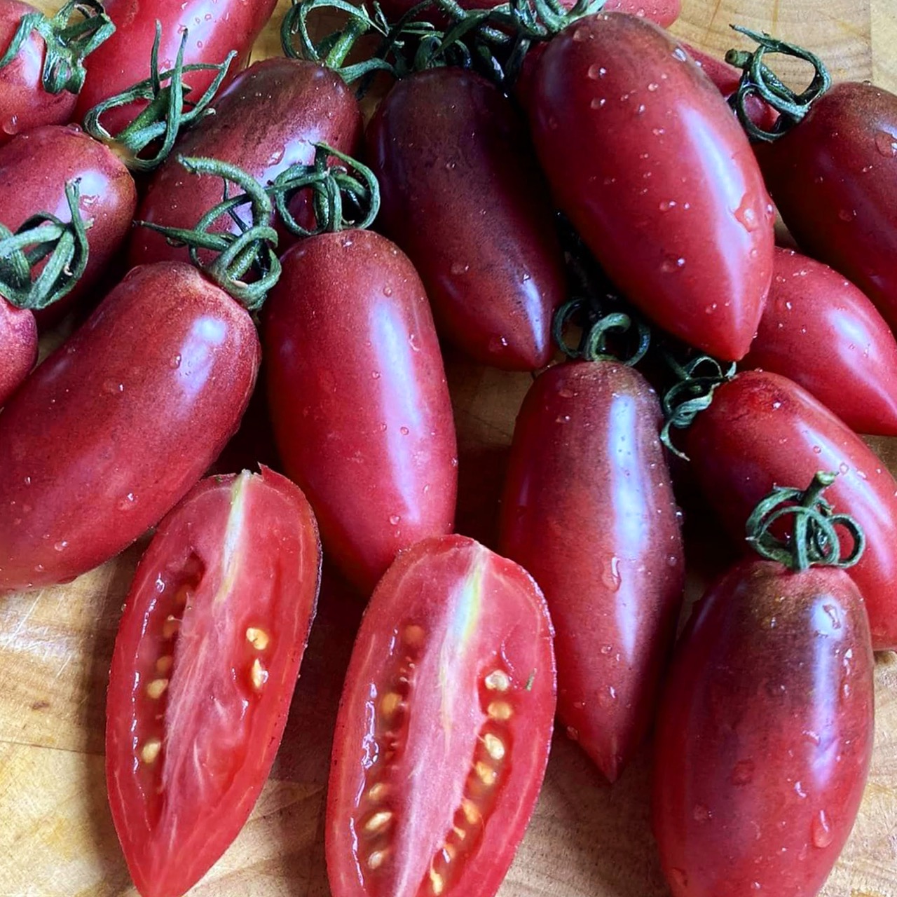 Slivka Gurman, which means “gourmet plum,” is a highly productive and easy-to-grow Eastern European variety. The indeterminate plant is vigorous and provides a steady harvest from mid-season until fall. The elongated plum-type fruits feature a purplish-pink skin with dark anthocyanin shoulders and fine decorative marbling. Their medium size and slender shape make them versatile in the kitchen. The flesh is dense, sweet, and slightly tart, with few seeds. Its firm texture makes it an excellent tomato for sauces, drying, or salads.