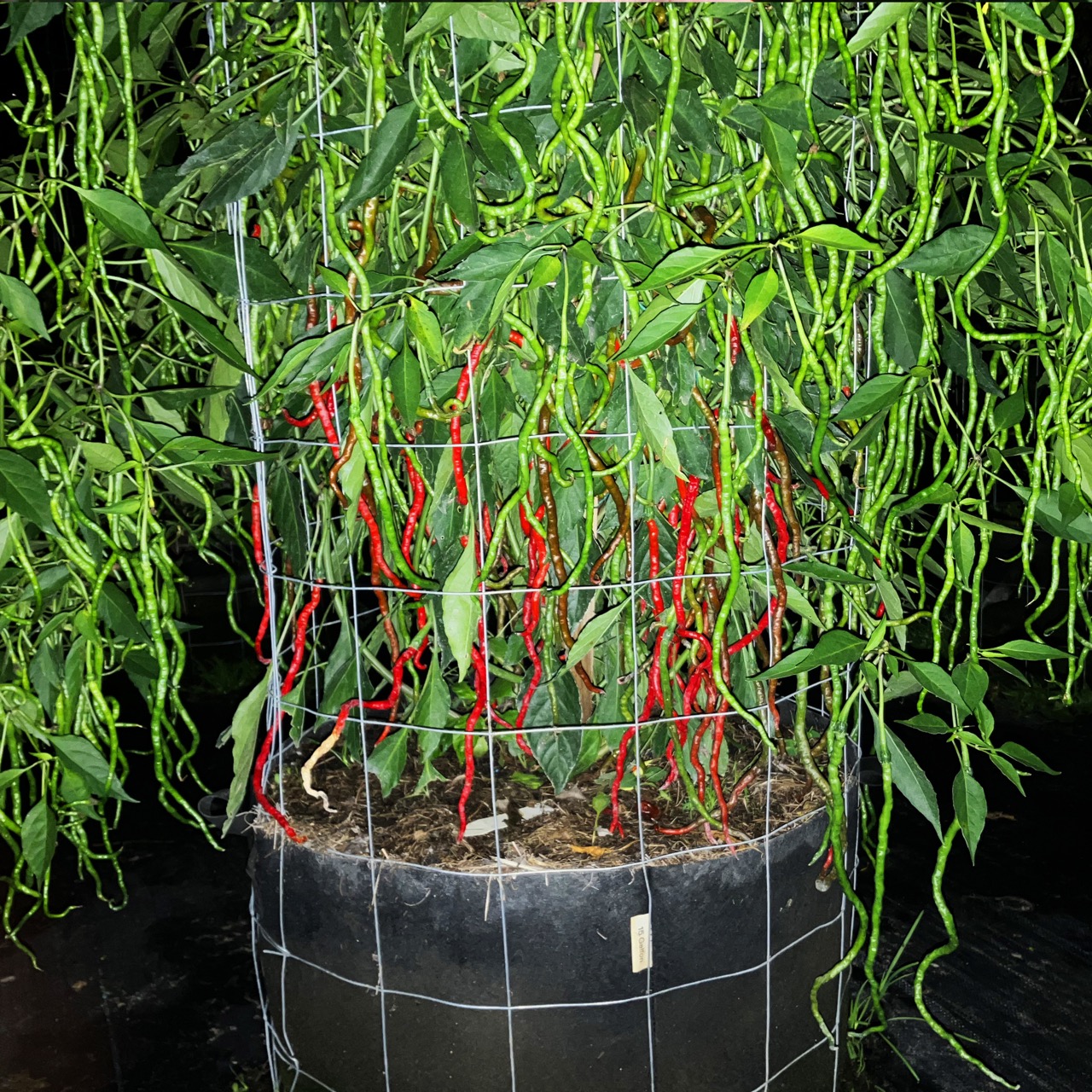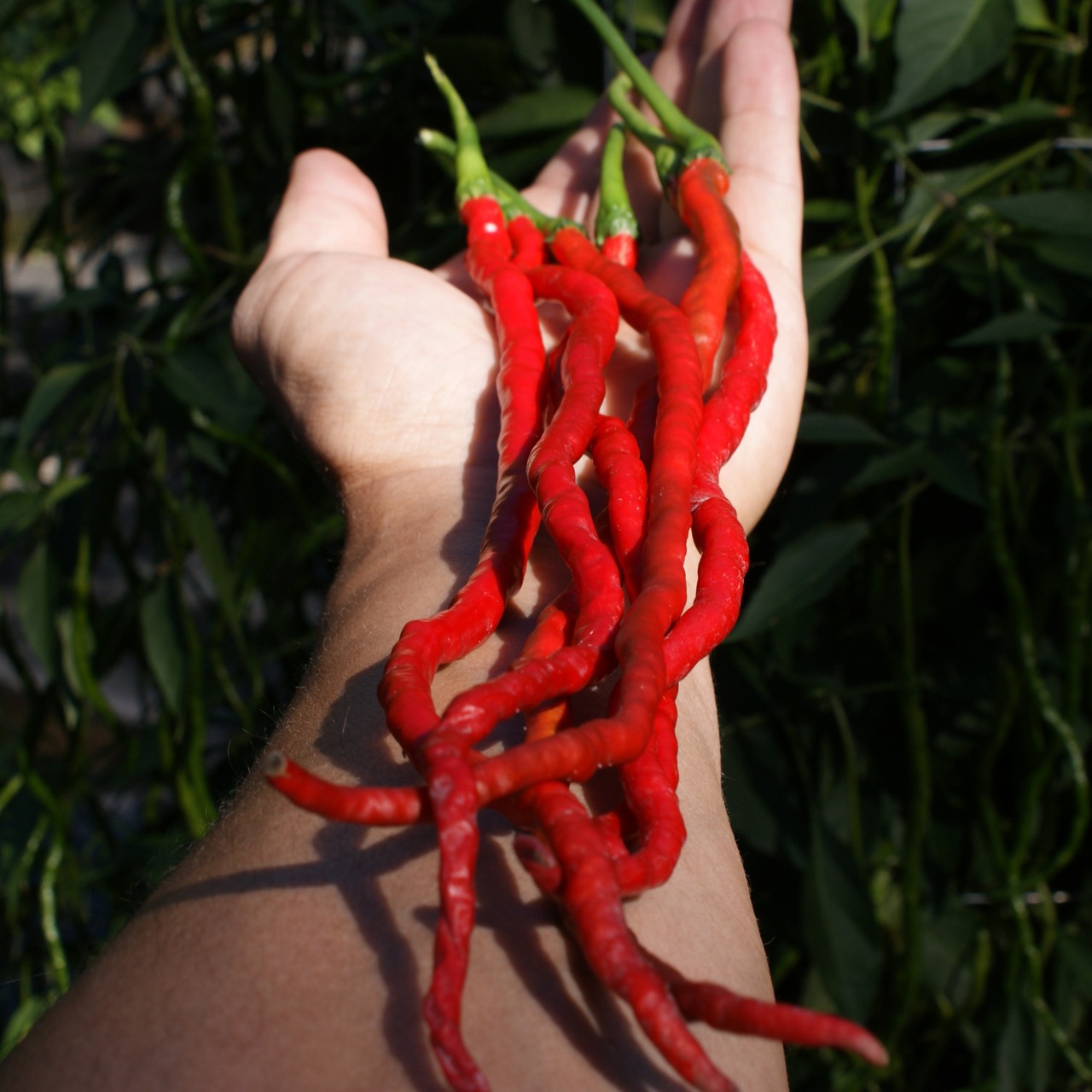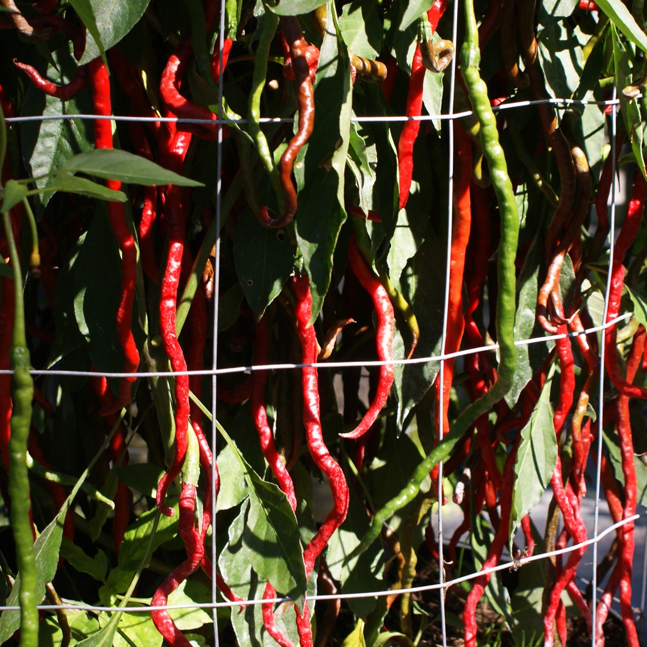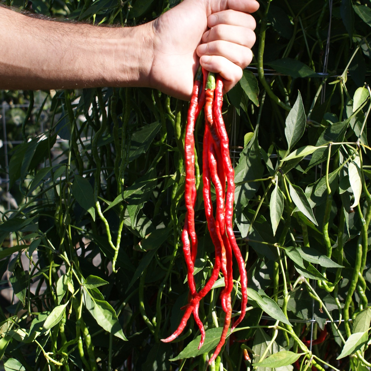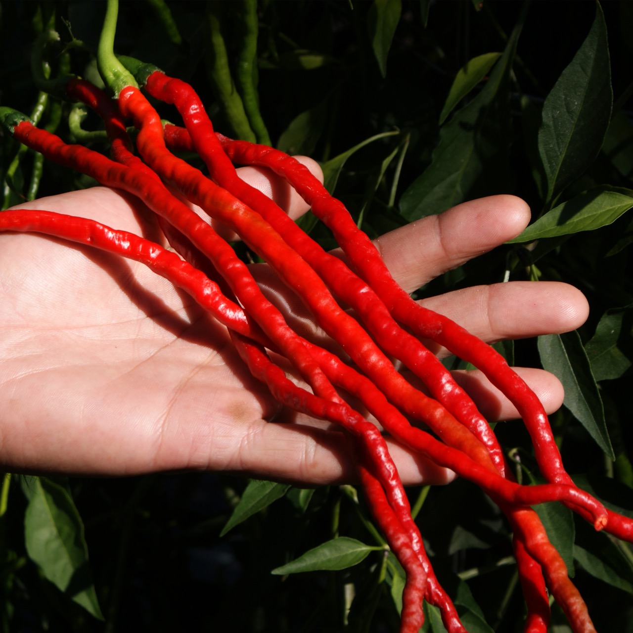 The Thunder Mountain Longhorn is an ancient and spectacular variety originating from Guizhou province in southwest China, where it has been cultivated for generations. This pepper impresses with its extremely long and slender fruits, which can exceed 30 cm in length. They ripen from light green to deep red and often exhibit a twisted or coiled shape. Their moderate heat is accompanied by a slightly smoky and herbaceous flavor. The vigorous and highly productive plants show excellent heat resistance. Reaching over a meter in height, it is recommended to stake them to support their growth and the weight of the fruits.
