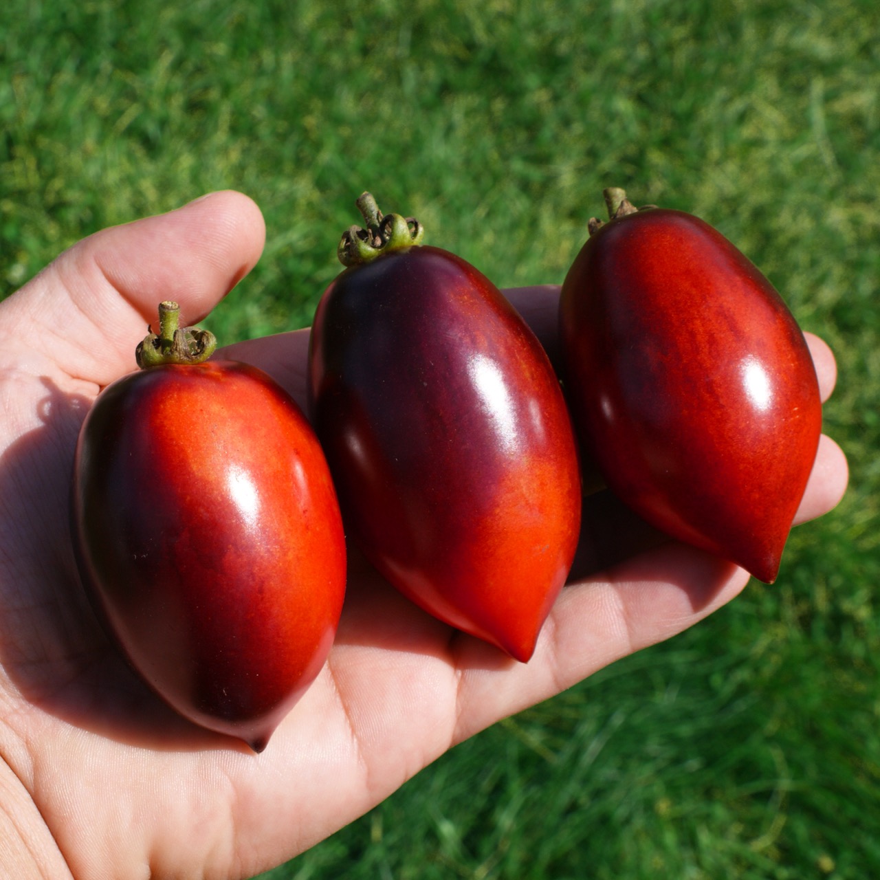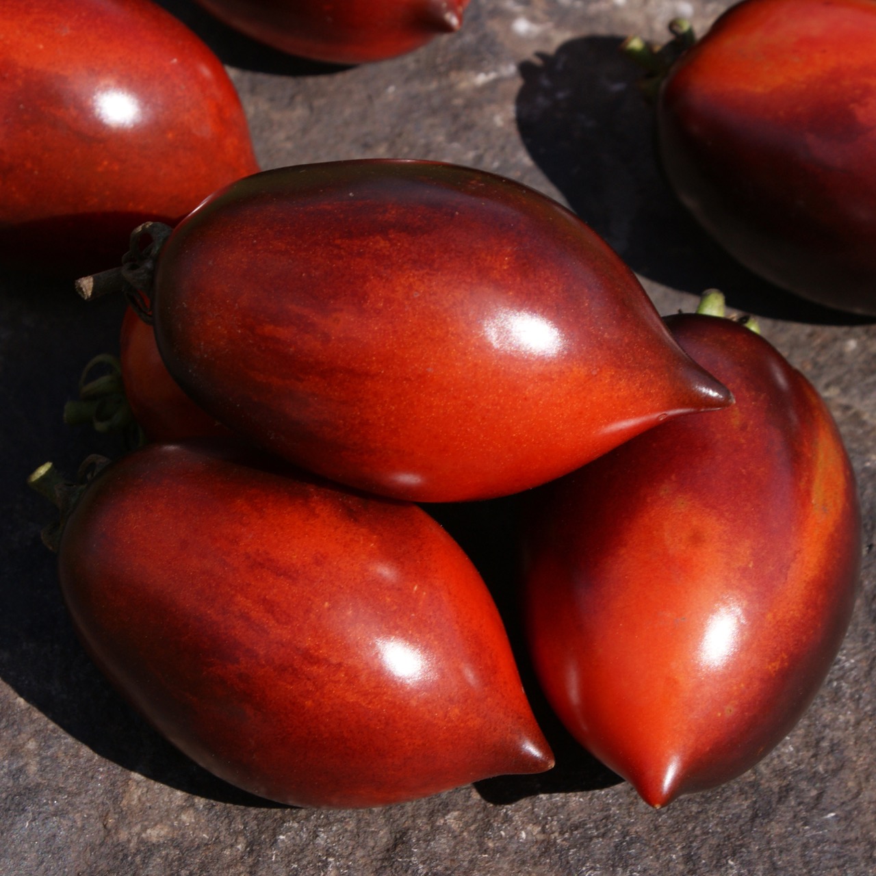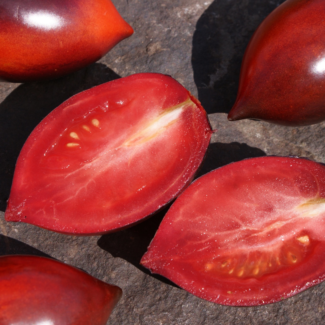 Blue Marzano est une variété rare et peu documentée dont le nom laisse supposer une parenté avec la célèbre tomate San Marzano , combinée à une lignée anthocyane . Bien que l'origine précise demeure inconnue, la variété a été commercialisée aux États-Unis par Bill Yoder , collectionneur de variétés anciennes et atypiques. Le plant, de croissance indéterminée à la pigmentation anthocyane, donnant aux fruits une robe bleu-violet très foncée sur les parties exposées, contrastant avec des zones rouge-orangé à maturité. Les fruits contenant peu de graines ont la forme de prune allongée , rappelant l a San Marzano, mais avec une coloration spectaculaire bien plus sombre. La saveur est douce, fruitée , étonnamment plus aromatique et moins “paste” que ce que l’on attend habituellement d’un type Marzano et c’est à pleine maturité qu’elle dévoile toute la richesse de sa saveur . Cette combinaison en fait une variété unique autant pour le goût que pour l’esthétique.