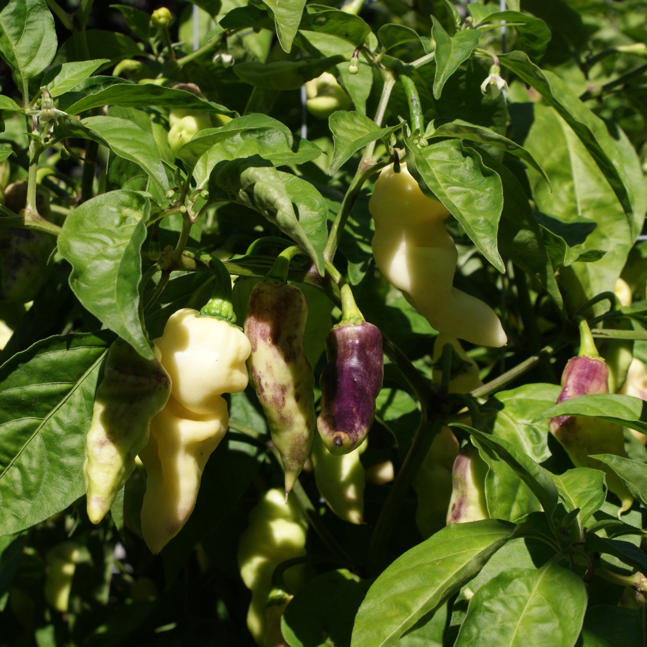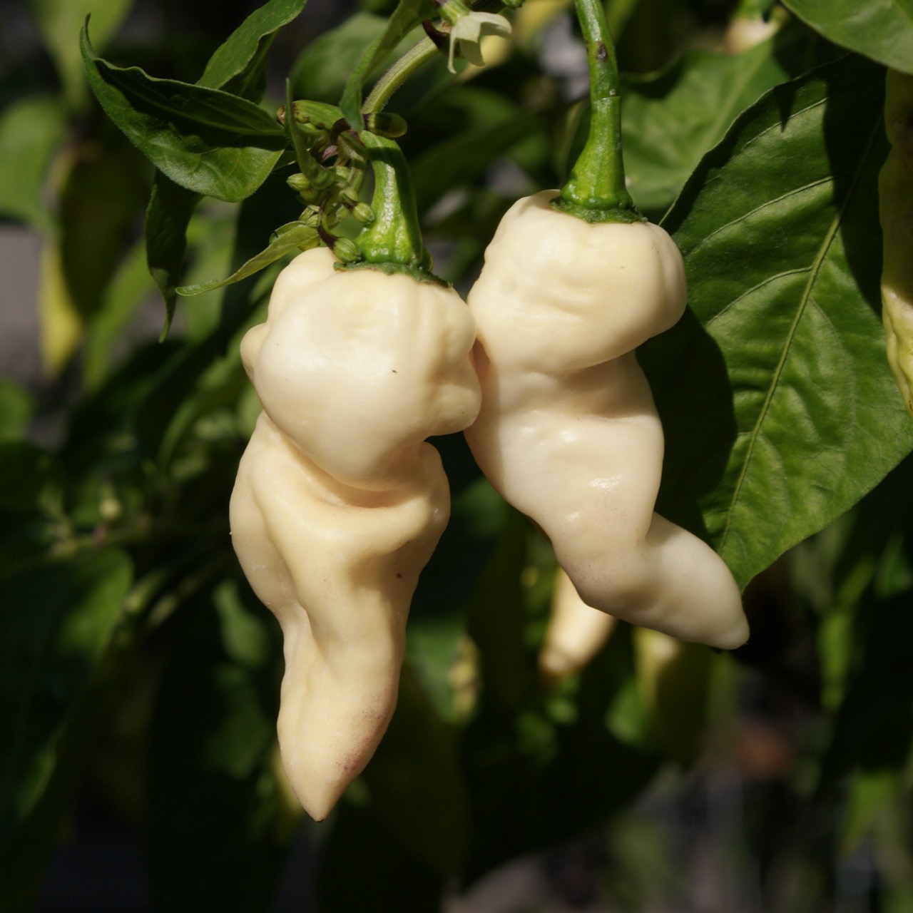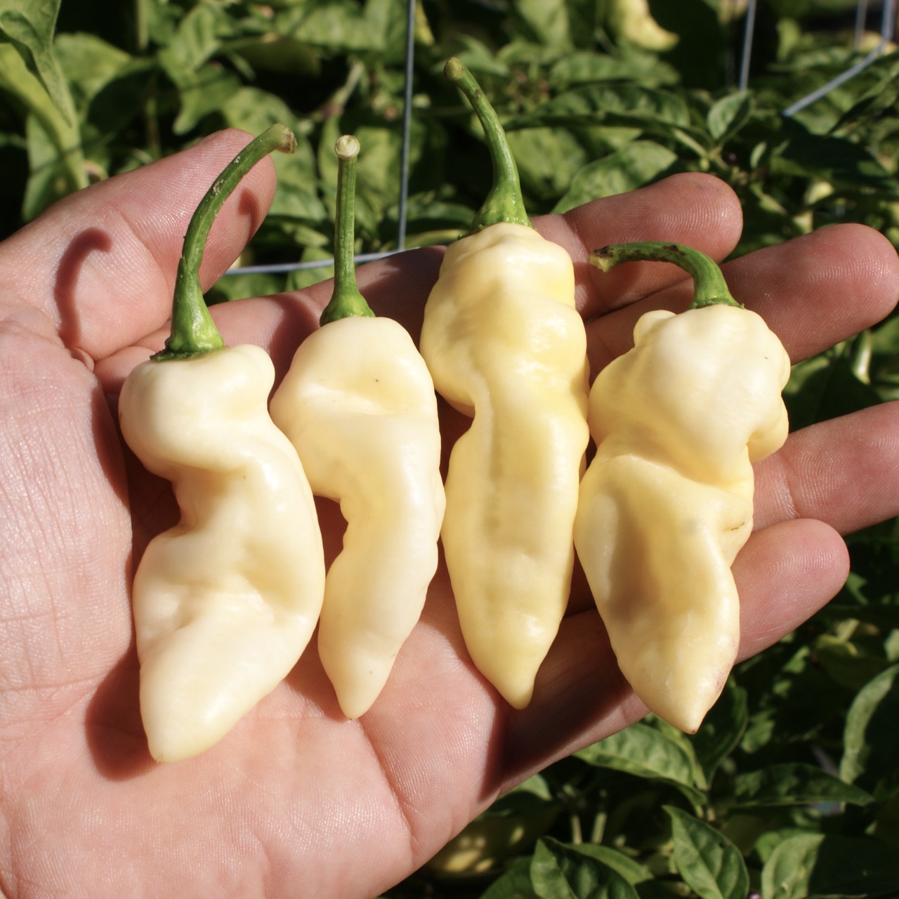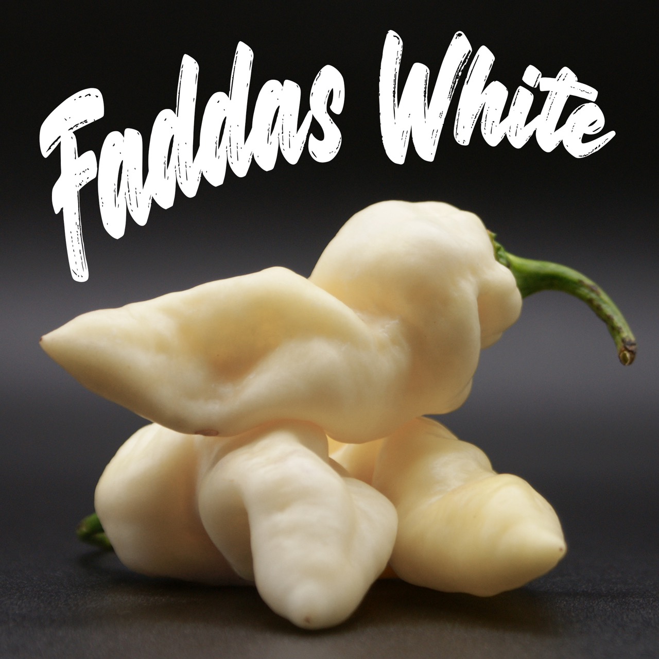 Le Faddas White est une création signée Giancarlo Fadda (Faddas P epper) . Ce piment résulte d’un croisement entre le White Ghost (Bhut Jolokia) et le Ghost Jami Yaki. Les fruits bosselés mûrissent jusqu’à atteindre une teinte blanc ivoire, presque blanc immaculée , avec une superbe finition mate qui ne reflète pas la lumière . Leur chair épaisse et huileuse révèle une saveur fruitée et légèrement florale , accompagnée d’un piquant explosif qui s’installe rapidement et persiste longuement .