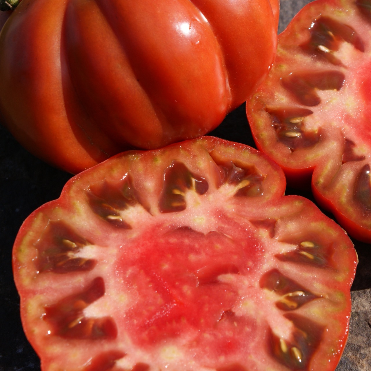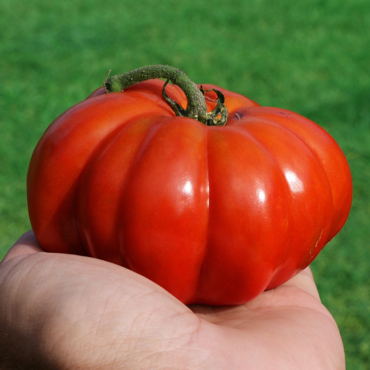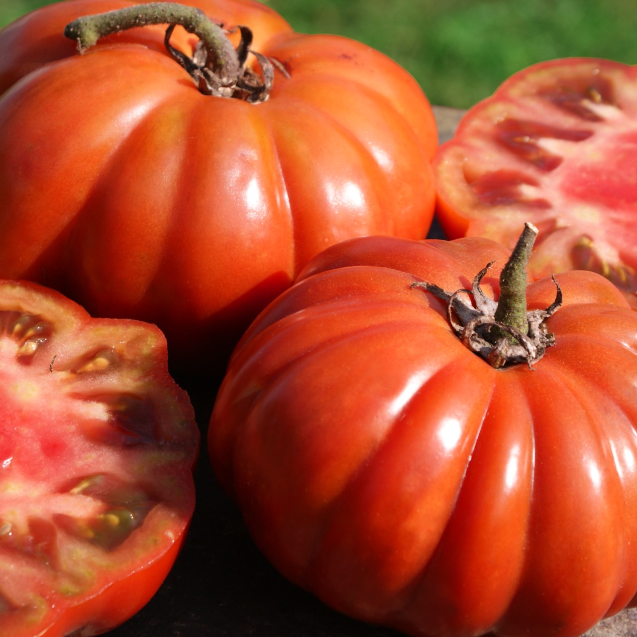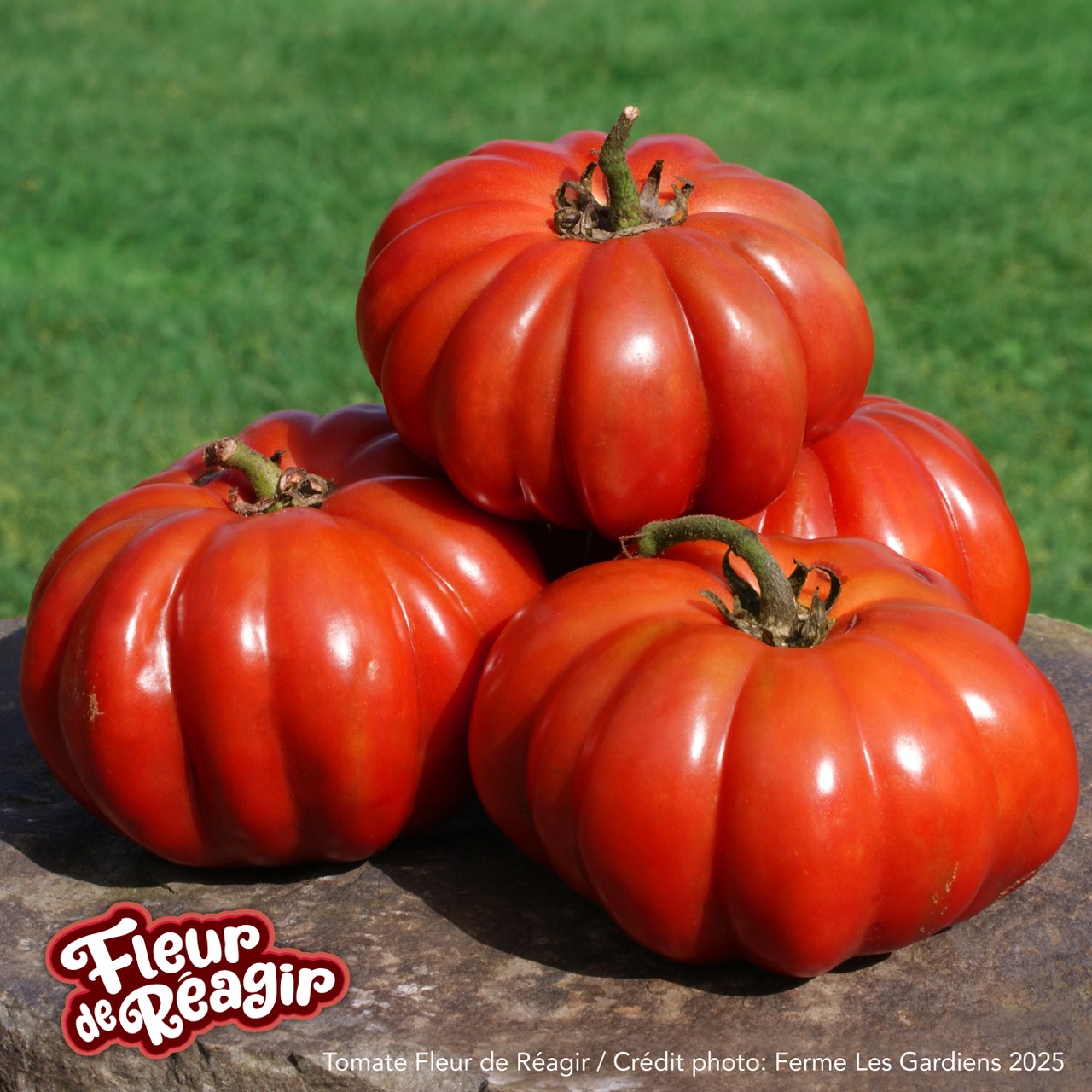 Fleur de Réagir est une variété française moderne qui se distingue par ses gros fruits côtelés rappelant la forme d’une fleur. Les tomates sont larges, aplaties et profondément découpées en lobes, ce qui leur donne une allure très décorative dans l’assiette comme au jardin. Leur couleur rouge à rouge orangé met bien en valeur ce relief marqué. La chair est dense , juteuse et douce, avec un goût agréable et équilibré, idéale pour les tranches épaisses, les salades et en cuisine. Sa croissance indéterminée et sa productivité en font une variété intéressante pour ceux qui recherchent à la fois esthétisme et saveur.