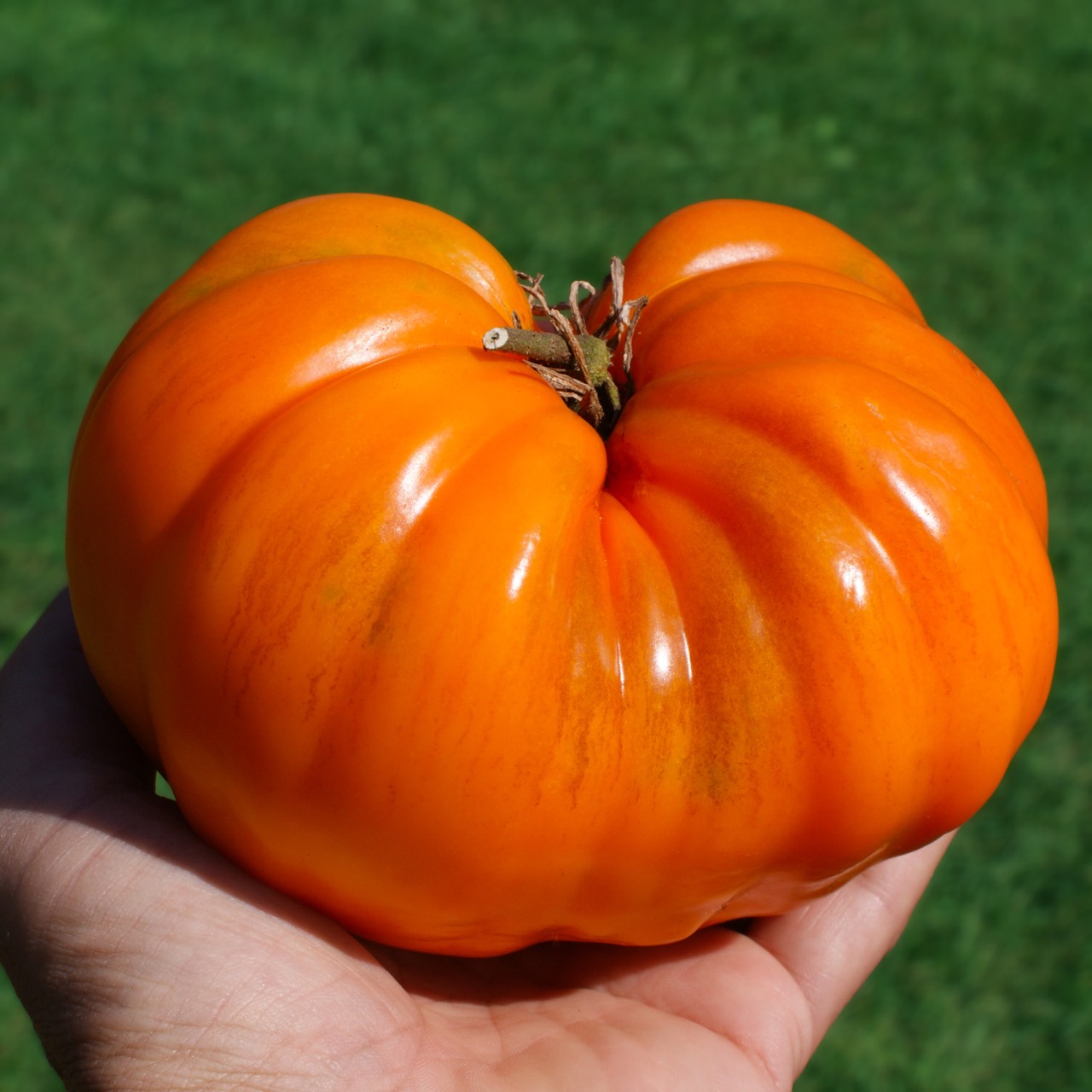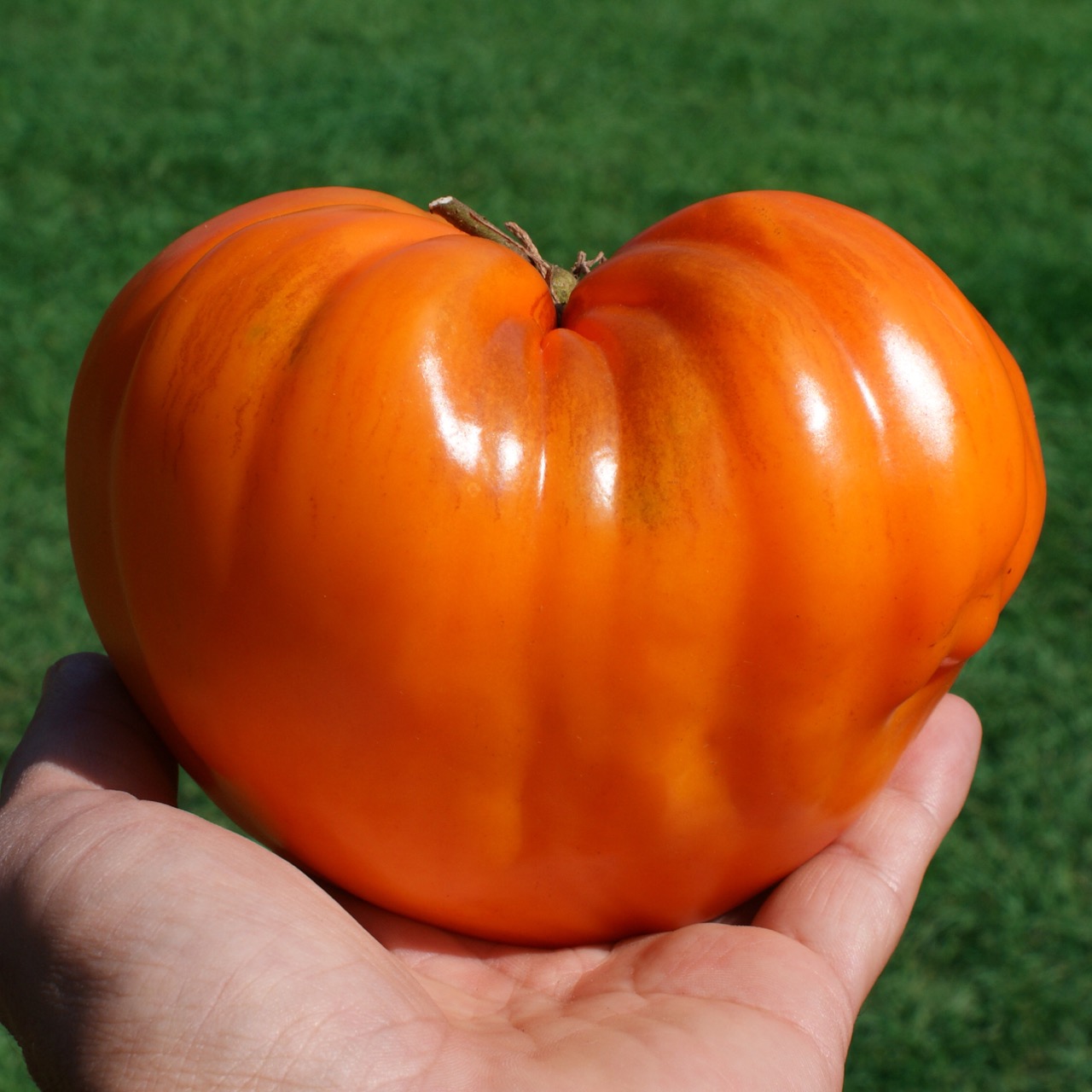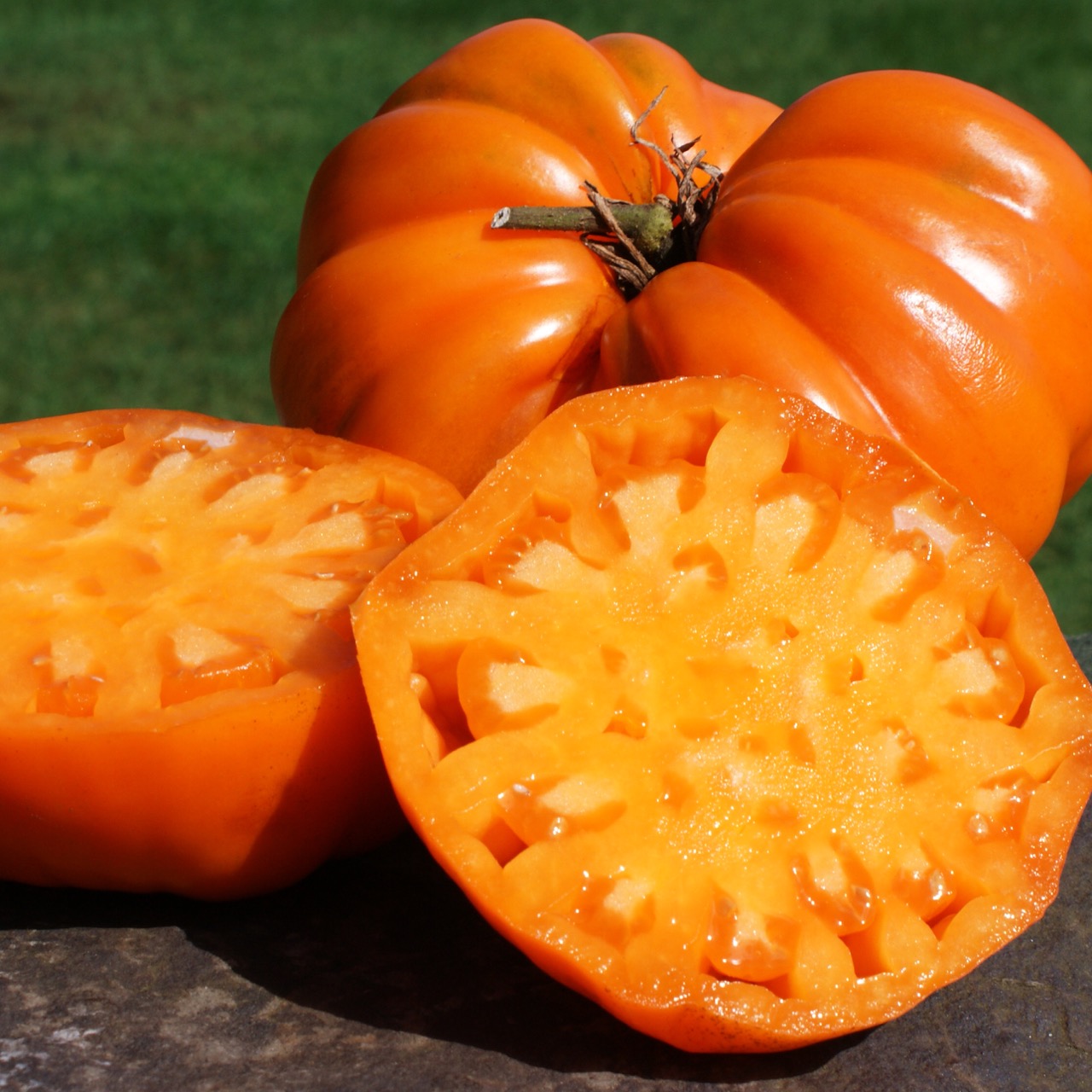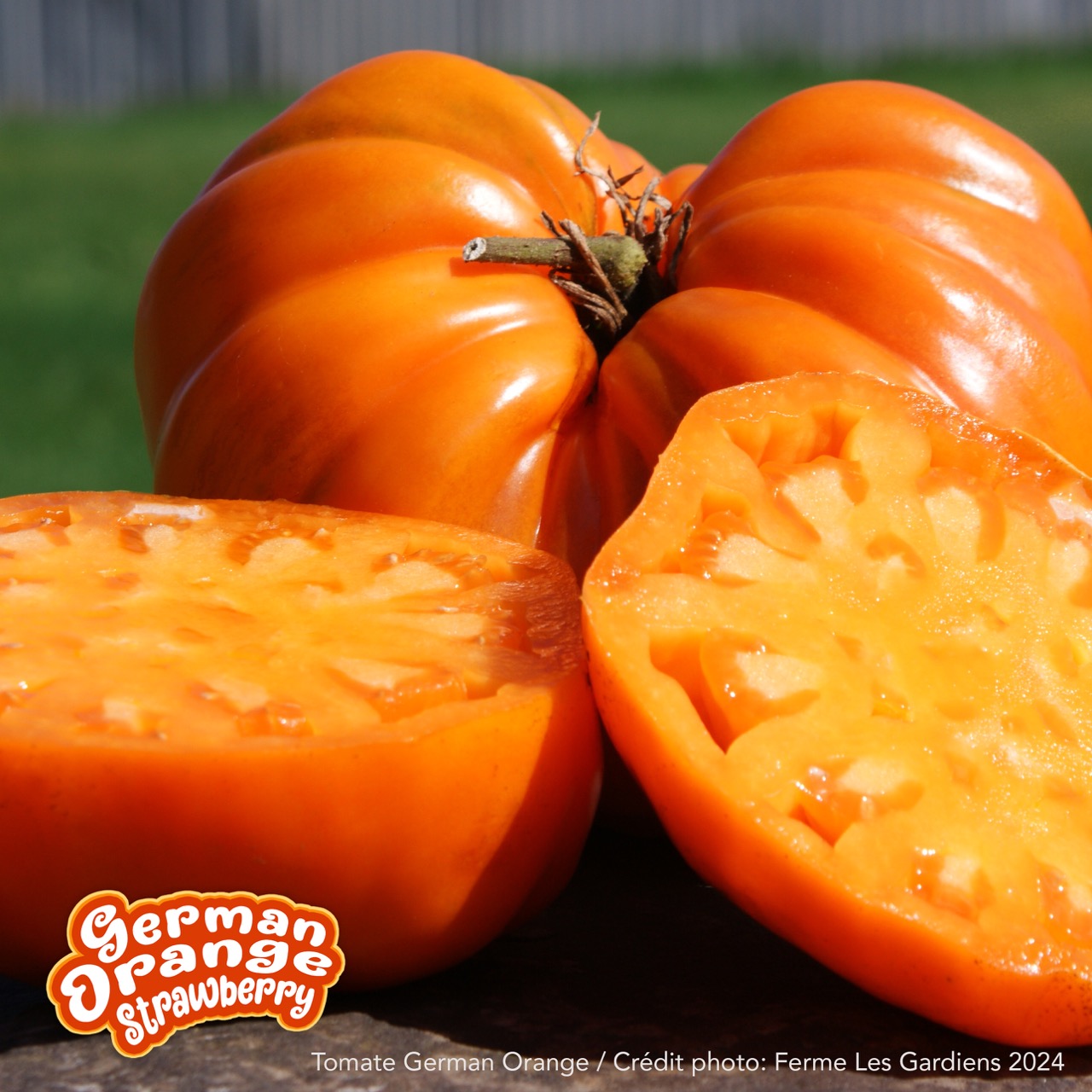 tats-Unis German Orange Strawberry est une variété qui à é té découverte par Marjorie Morris , en Indiana, comme une graine perdue dans un sachet commercial de tomates Ananas. Elle transmit ensuite la variété à la spécialiste Carolyn Male, qui la publia pour la première fois dans le Seed Savers Exchange Yearbook de 1995 . R éputée pour ses splendides gros fruits en forme de cœur , d’un orange vif et lumineux rappelant une fraise géante, d’où son nom évocateur. Les fruits très peu de graines sont charnus, légèrement aplatis vers la base et très généreux, avec une chair épaisse, dense et fondante , digne des meilleures tomates de type cœur de bœuf. La saveur est douce, fruitée, riche et parfaitement équilibrée, avec une texture soyeuse idéale pour les tranches épaisses, les salades et la cuisine .