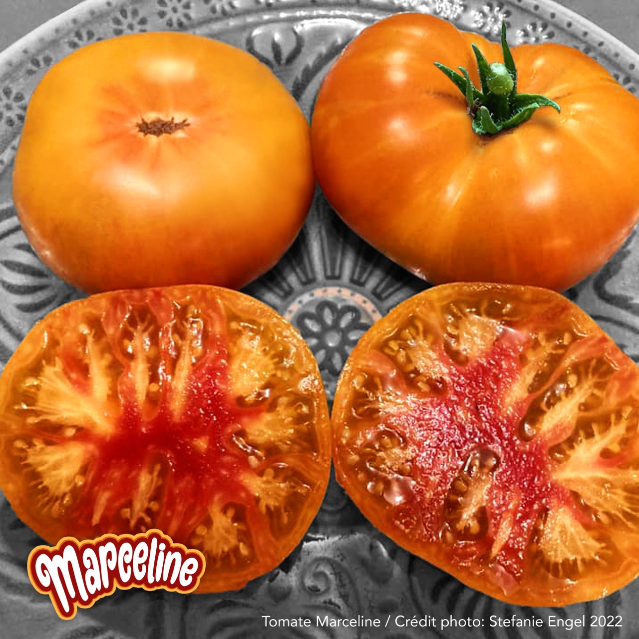 Marceline est une variété rare et encore peu connue, issue d’un croisement entre une tomate Ananas et une variété “Russe” , créé et développé jusqu’en 2008 par Marcel Monfort , en Savoie (France). Le plant est robuste, vigoureux, à feuillage régulier, et possède une croissance indéterminée avec un grand développement. Elle produit de gros fruits beefsteak de 300 à 500 g , ronds, charnus, avec des nervures plus ou moins marquées sur les épaules . La robe est bicolore jaune et rouge , formant de très beaux marbrages internes et externes. La chair est grasse, juteuse , avec un goût équilibré et fruité , typique des bonnes variétés bicolores. La productivité est abondante et régulière , et la variété se montre étonnamment précoce pour des fruits de cette taille . Adaptée aux conditions climatiques fraîches , elle performe bien même dans les régions au début d’été plus lent.