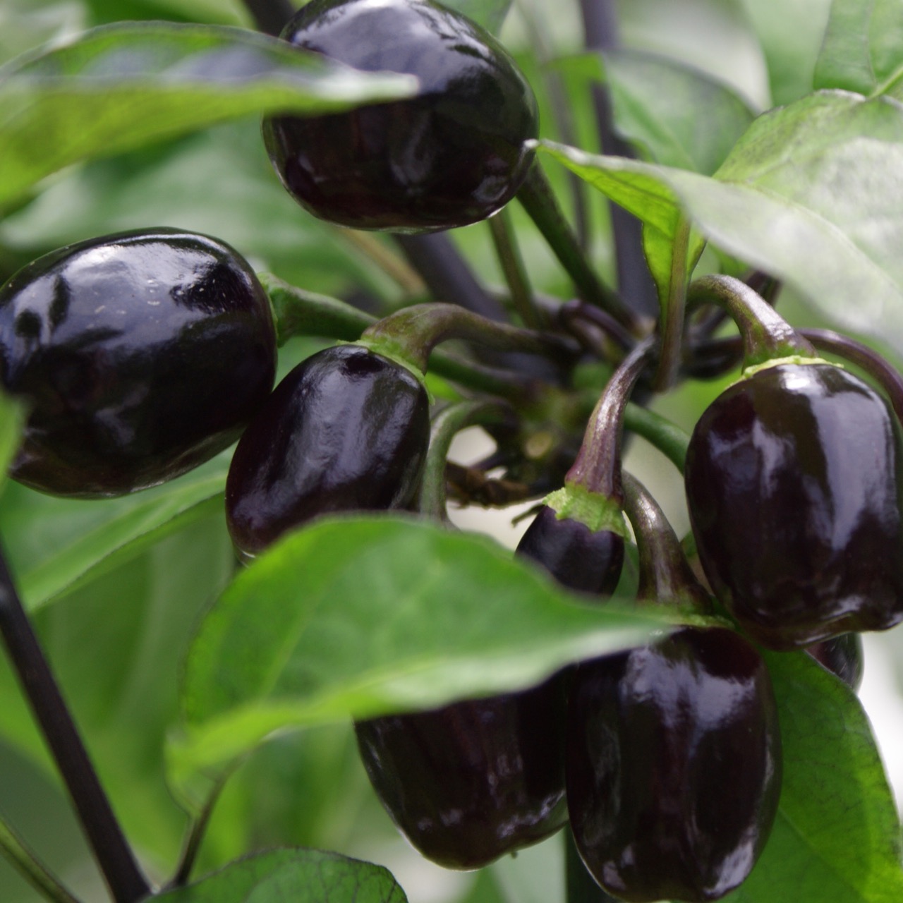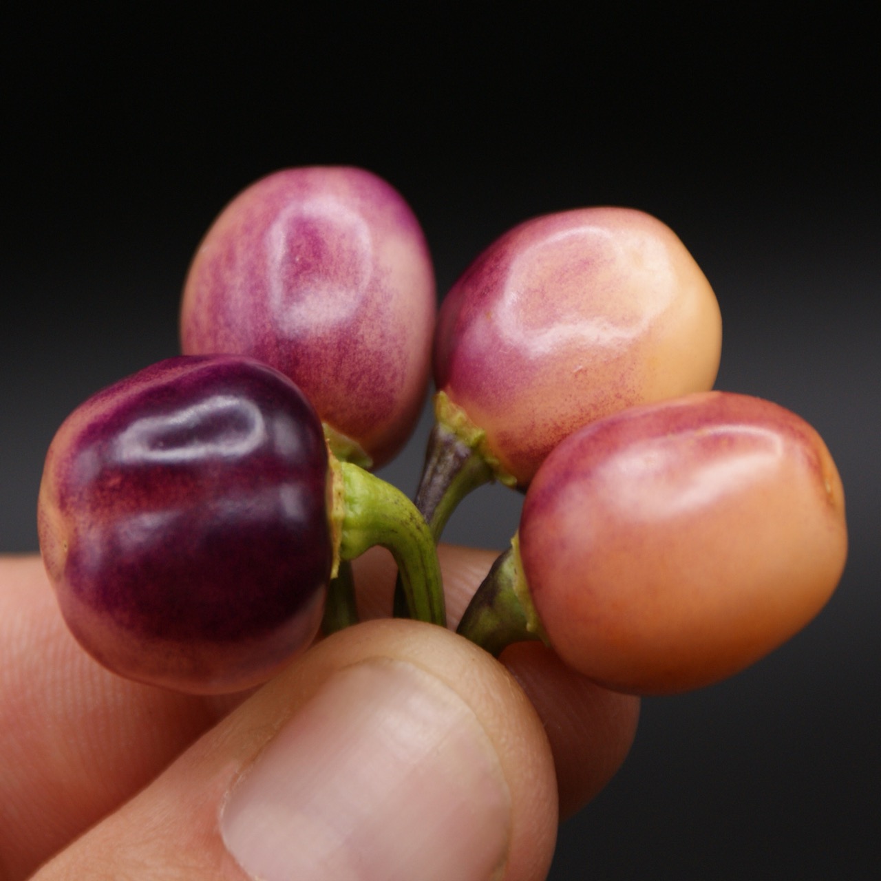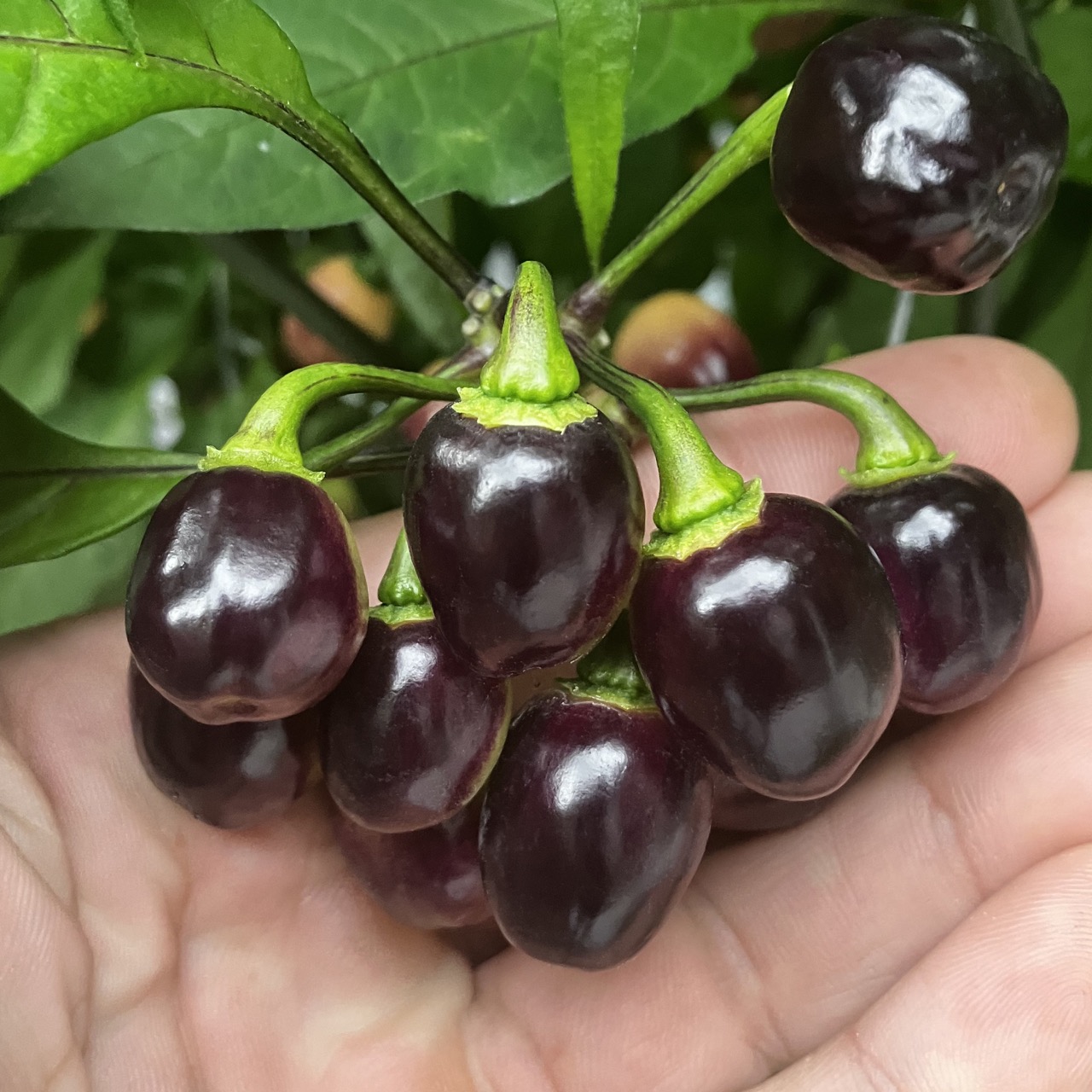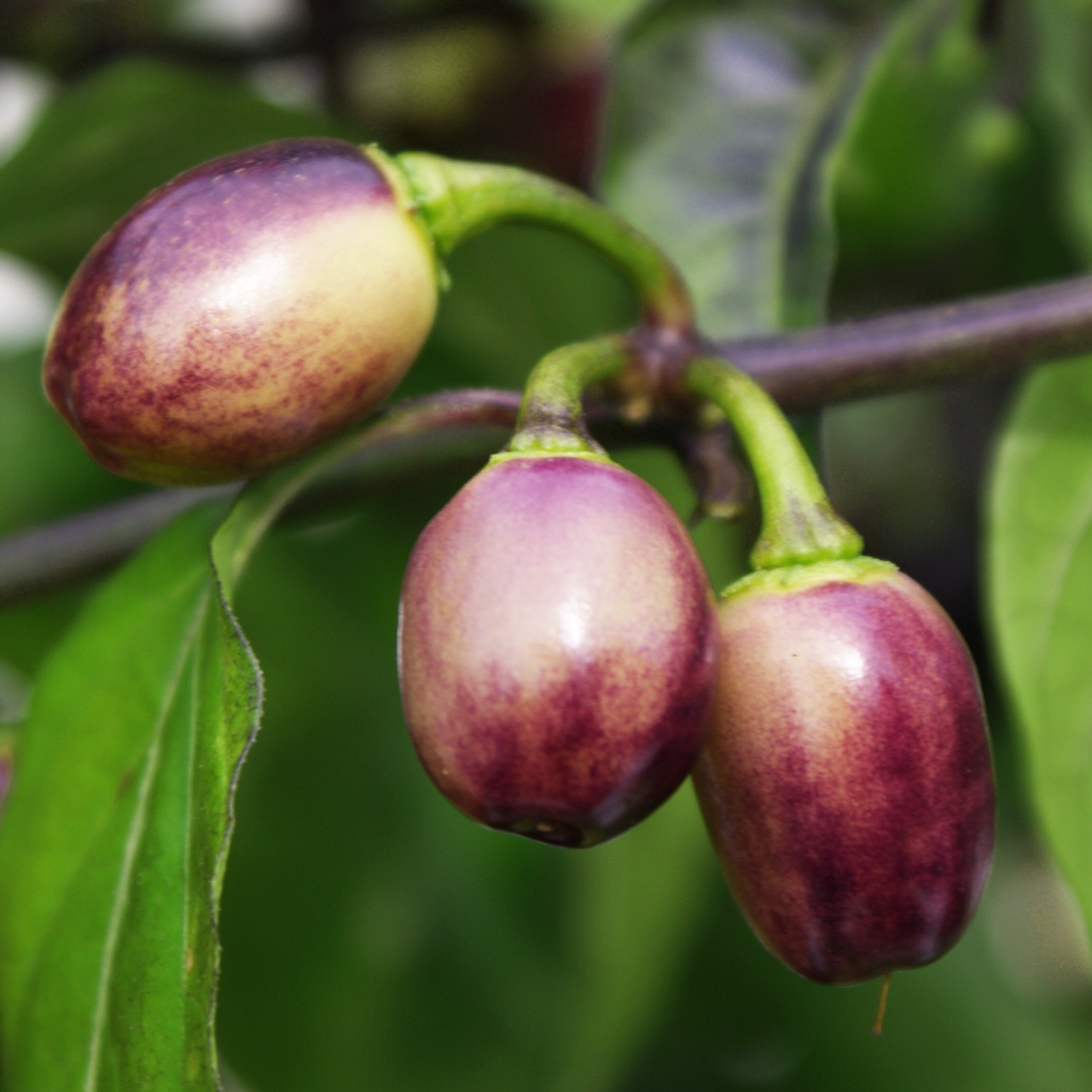 Le Olho de Mutum , qui signifie “œil de mutum” (un oiseau sauvage du Brésil), est une variété traditionnelle brésilienne originaire de la région de Minas Gerais . Apprécié depuis des générations, il se distingue par son profil aromatique complexe , à la fois fruité, légèrement fumé et citronné , combiné à une chaleur modérée qui le rend très polyvalent en cuisine. Leur chair fine et aromatique libère une belle intensité sans excès. Les petit fruits ronds et luisants , passent du vert pâle au violet foncé , puis développent à maturité de magnifiques nuances rosées et pêche . Les plants sont vigoureux et très productifs , offrant de nombreux petits fruits uniformes tout au long de la saison.