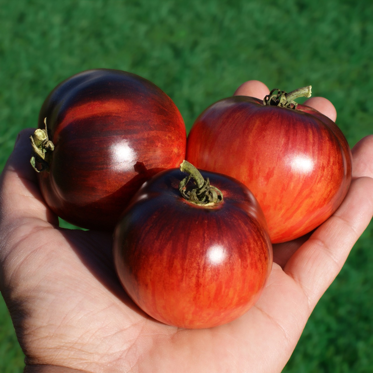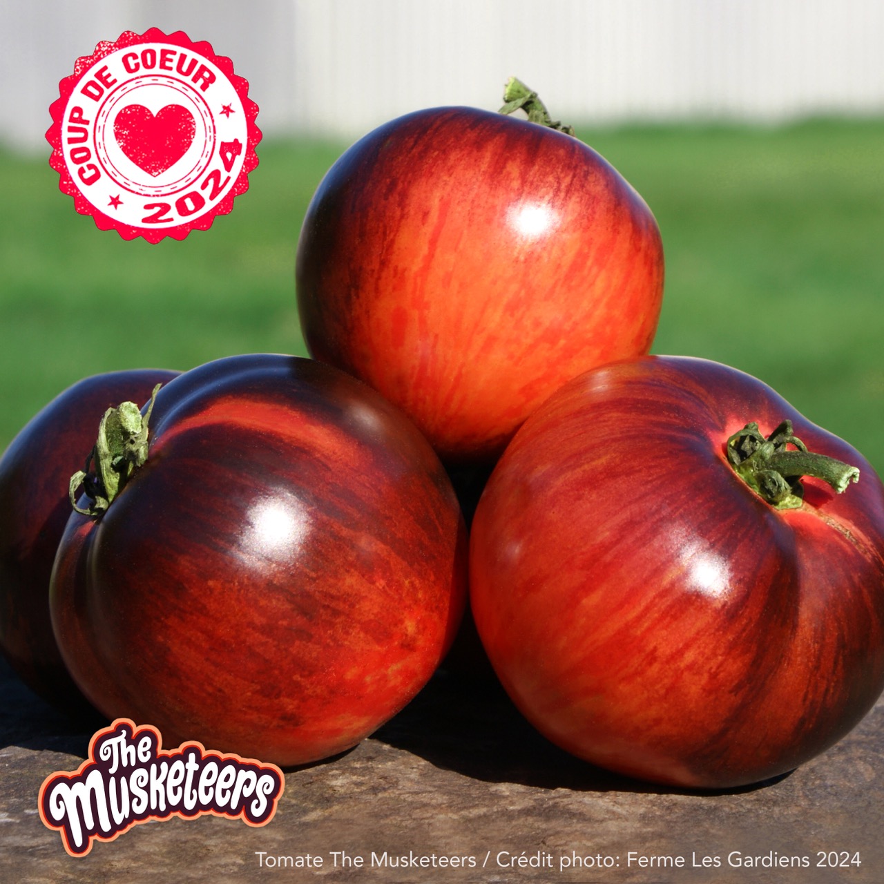 The Musketeers est une variété française récente, obtenue par Bruno Fournier à partir d’une lignée issue du croisement de Pink Berkeley Tie-Dye × Indigo Rose , créé initialement par Brad Gates. Elle a été finalisée autour de 2017 et baptisée lors de la fête des plantes du château de Saint-Jean-de-Beauregard, en hommage au surnom « les Mousquetaires » donné à l’équipe Tomatophile / Cultive ta rue. Le plant, de croissance indéterminée , est vigoureux et très productif, portant de nombreux fruits de type globe, rondes à légèrement aplatie . À maturité, les tomates passent d’un vert strié de rose et de violet à une palette multicolore : crème, jaune doré, orangé, rouge profond, au épaules anthocyanes sombres . La chair est charnue, tendre, juteuse et une saveur douce, riche et bien équilibrée , idéale pour la consommation fraîche, les salades colorées, les sauces et même la cuisson au four ce qui la rend très versatile en cuisine .