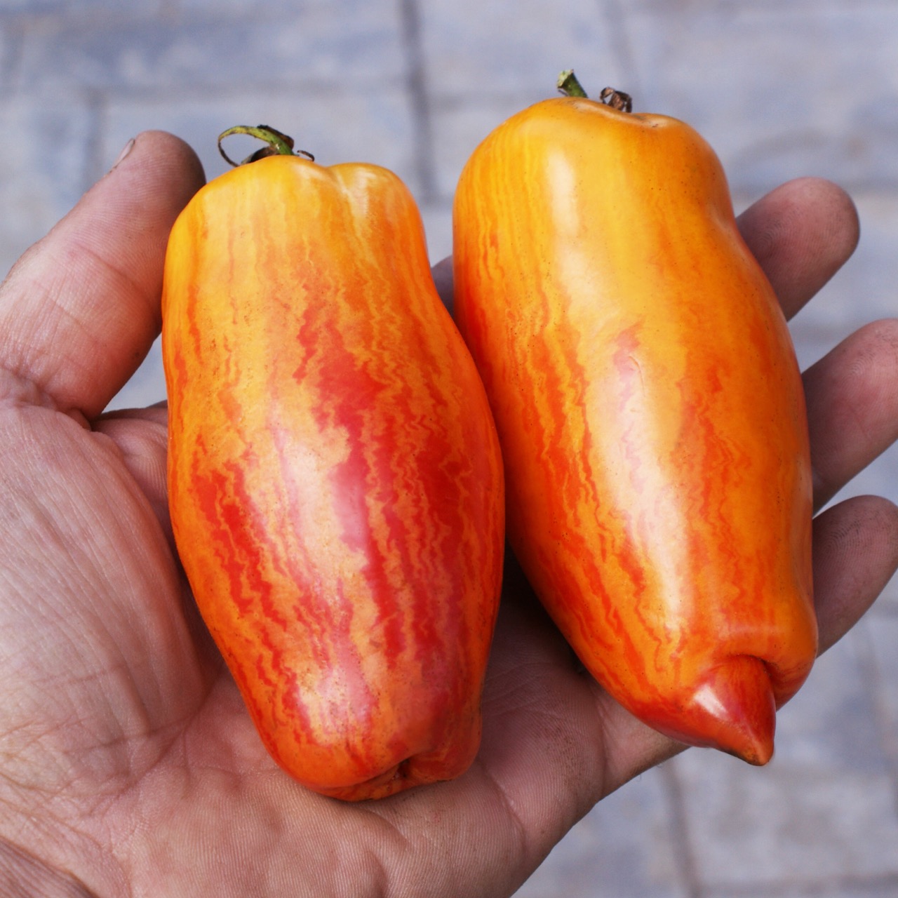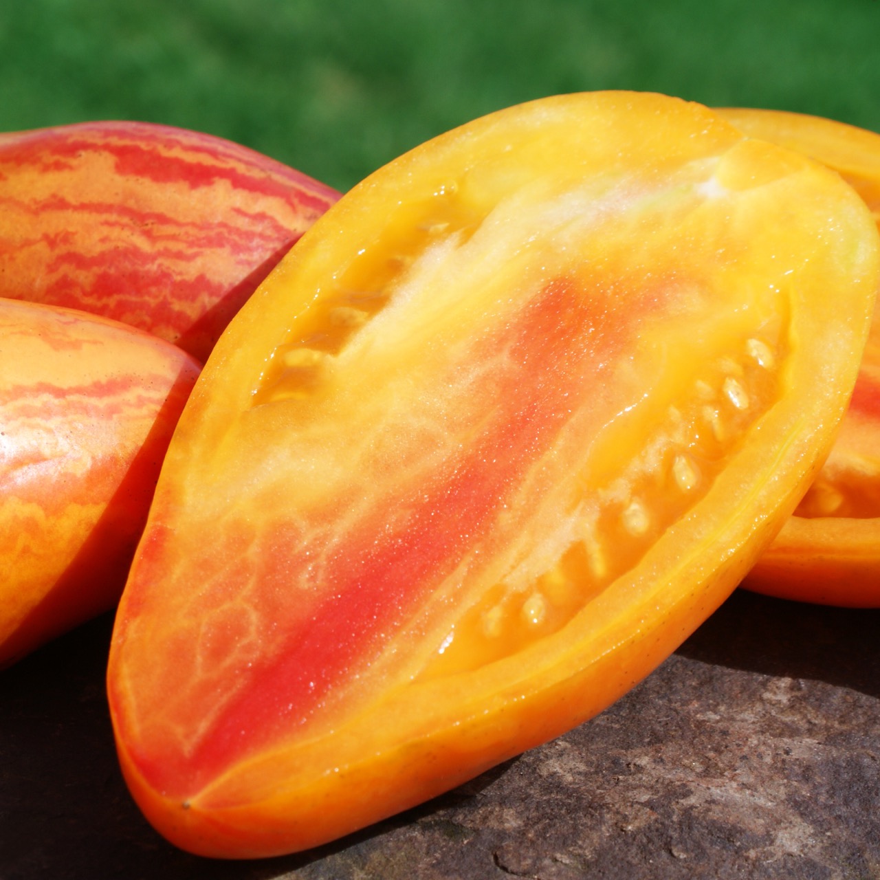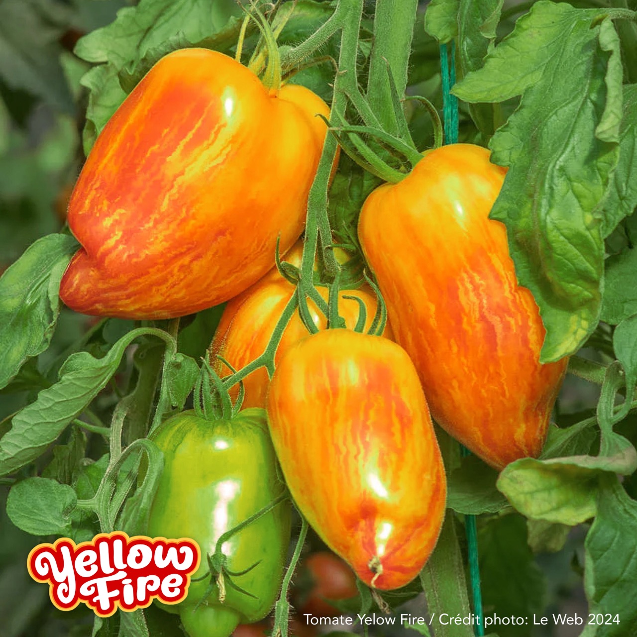 Yellow Fire est l’une des première variété développé par Fred Hempel (Artisan Seeds). P eu connue mais très appréciée pour son aspect spectaculaire et sa polyvalence en cuisine. Le plant est vigoureux et produit une abondance de fruits de calibre moyen. Les fruits de type Roma sont allongés, plus ou moins joufflues, se terminant par une pointe souvent légèrement invaginée. Sa robe jaune vif rayée de rouge orangé e , lui donne une apparence flamboyante. S a chair est dense et charnue mais relativement juteuse contenant peu de graines. Elle est excellente pour les sauces, les conserves et le séchage, où elle donne des “petites bombes de sucre”, mais sa saveur est nettement supérieure à la plupart des autres tomates de type Roma, ce qui permet aussi une bonne consommation fraîche.